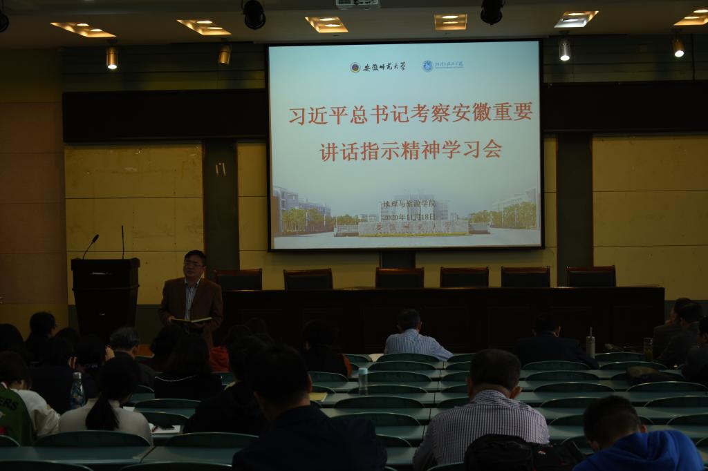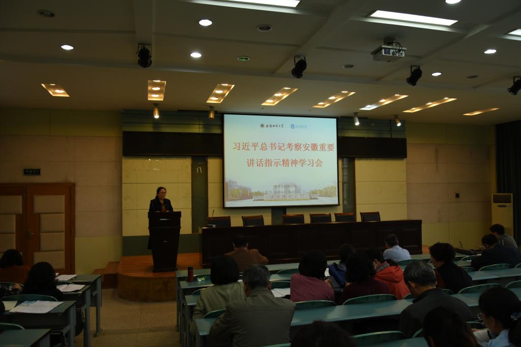 于实验楼101报告厅组织开展学习习近平总书记视察安徽重要讲话精神学习会,由院长苏勤领学,副院长方凤满做专题发言,女同做爱