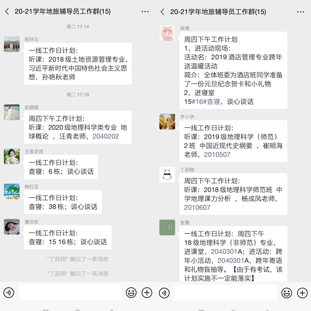 积极响应学校号召,率先推出辅导员“一线工作法”,全体专兼职辅导员在每周的“无会日”深入学生课堂、寝室、网络、活动现场,倾听学生心声。在2021年即将到来之际,“一线工作法”模式开启了女同做爱