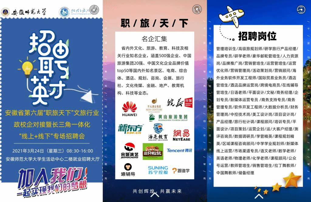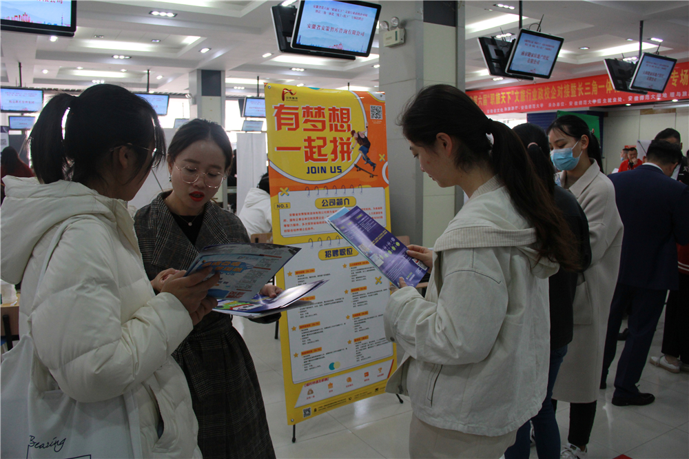 承办的安徽省第六届“职旅天下”文旅行业政校企对接暨长三角一体化“线上+线下”专场招聘会由我校成功举办。来自全国各地的120余家企业通过线下线上来校招贤纳士、选聘英才,6000多个招聘岗位涉及文化、旅游、教育、科技等多个门类,涵盖世界和中国500强、中国旅游集团20强、中国文化企业品牌价值TOP50等多个业态。招聘会吸引了全校及周边高校毕业生的积极参与。