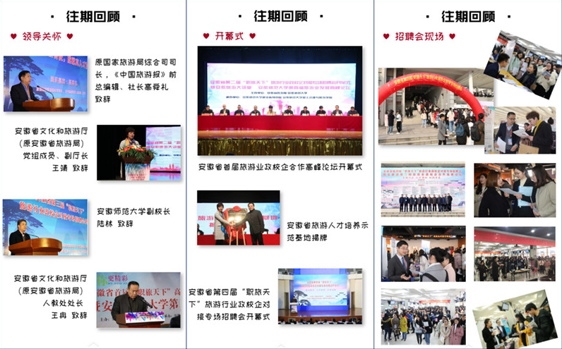 、“开元”订单班等一批政校企合作项目开花结果,一批创新创业项目和教学成果奖项应运而生,积极推动了各高校旅游及相关专业毕业生就业工作。“职旅天下”活动已成为安徽省乃至华东地区“起步最早、规模最大、影响最广”的高校旅游行业政校企合作重要平台和就业品牌之一,活动相继受到新华网、国家旅游局官网、《中国旅游报》《安徽日报》等新闻媒体的广泛报道。今年,为主动应对新冠肺炎疫情防控形势,积极响应教育部有关工作要求,活动首次采取“线上+线下”同时进行的形式举办高校文化和旅游专场招聘会,助力疫情防控常态化背景下的高校就业工作,服务长三角高质量一体化发展国家战略和全面建设现代化五大发展美好安徽奋斗目标。