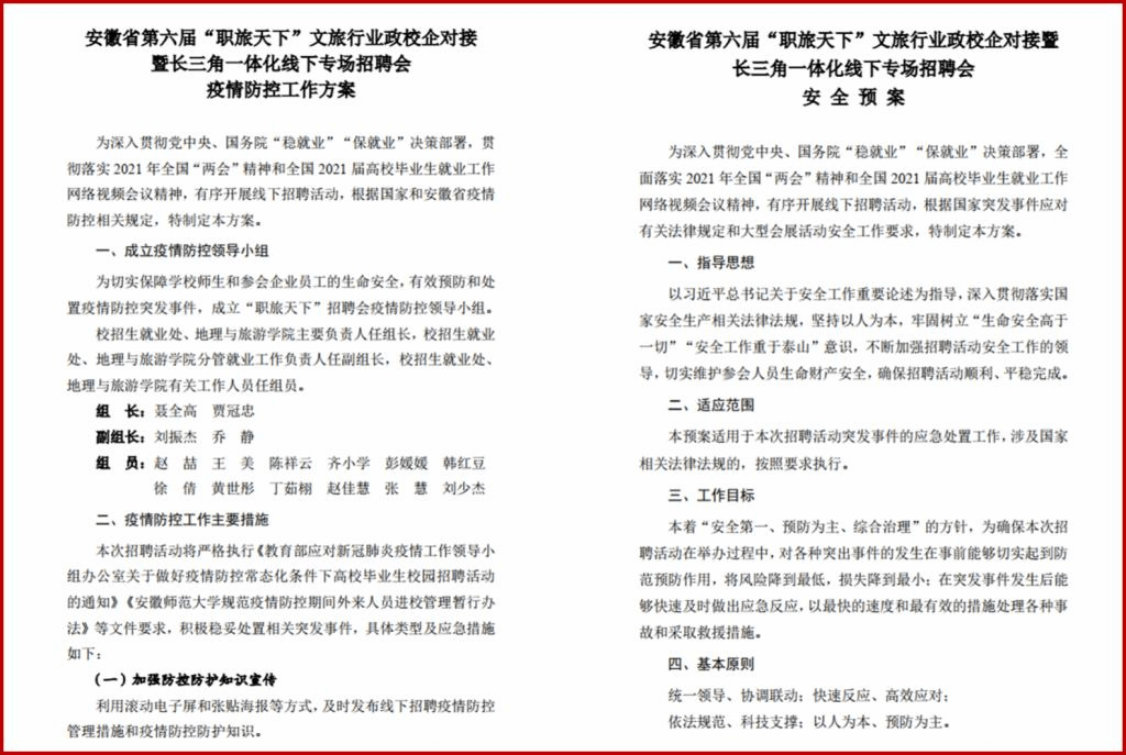 为有序开展线下招聘活动,根据国家和安徽省疫情防控相关规定、突发事件应对有关法律法规和大型会展活动安全工作要求,制定了疫情防控工作方案和安全预案,成立“职旅天下”招聘会疫情防控和安全处置领导小组,加强防控防护知识宣传,落实服务场所防控要求,强化招聘现场防控管理,建立突发事件应急处置机制。特别是在招聘会召开前后,安排工作人员对招聘大厅、扶梯、洗手间等公共区域和招聘展位台面、公共桌椅、展板等进行消毒,配备额温仪和消毒用品,招聘会大厅出入口设置监测岗,采用“安康码绿码+佩戴口罩+测量体温”方式对进场人员进行核验,切实维护参会人员生命财产安全,确保招聘活动顺利、平稳。