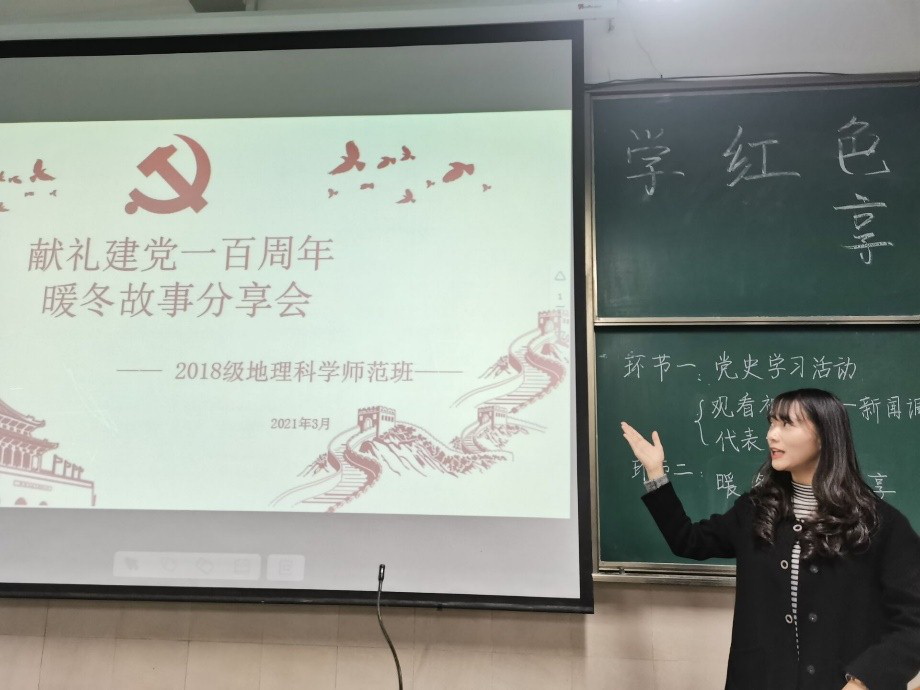 为庆祝建党100周年,巩固寒假生活。2018级城乡规划和地科师范班开展 “学党史,忆党章”暨“逐梦暖冬,筑梦青春——我的暖冬故事分享会”团日活动。郭鑫龙和李磊同学,从路的发展切入,讲述家乡的变迁。李磊表示,过去从家去镇上都得坐船,如今去镇上可以选择多种交通工具,十分方便。王文强向同学们分享了自己在家阅读所得,积极地向大家传授学习经验;许婉清则从分享了自己在家上网课的所得所感。