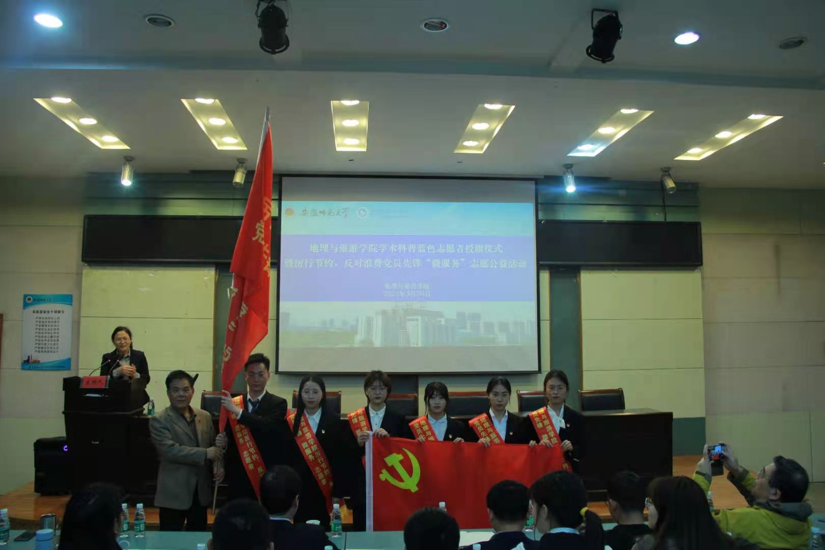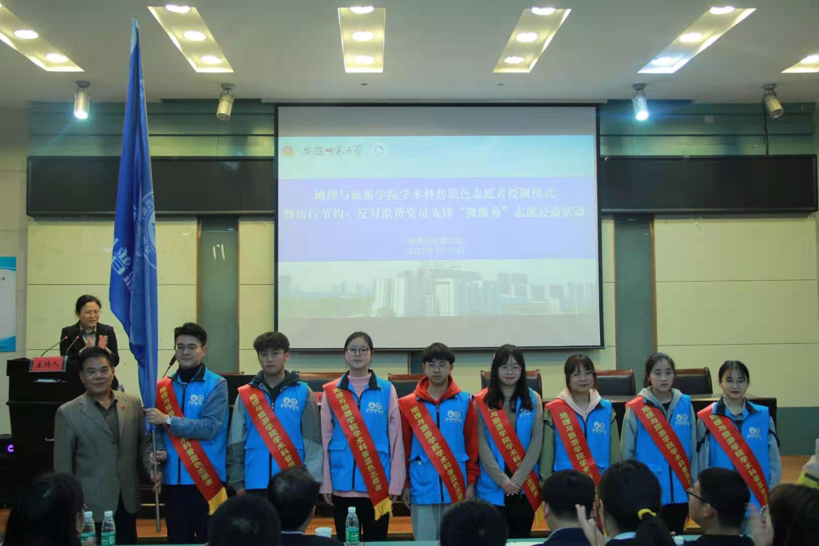 实验楼101报告厅举办学术科普蓝色志愿者授旗仪式暨厉行节约、反对浪费党员先锋“微服务”志愿公益活动,中国科学院地理科学与资源研究所研究员、中国自然资源学会理事长成升魁为志愿者授旗。