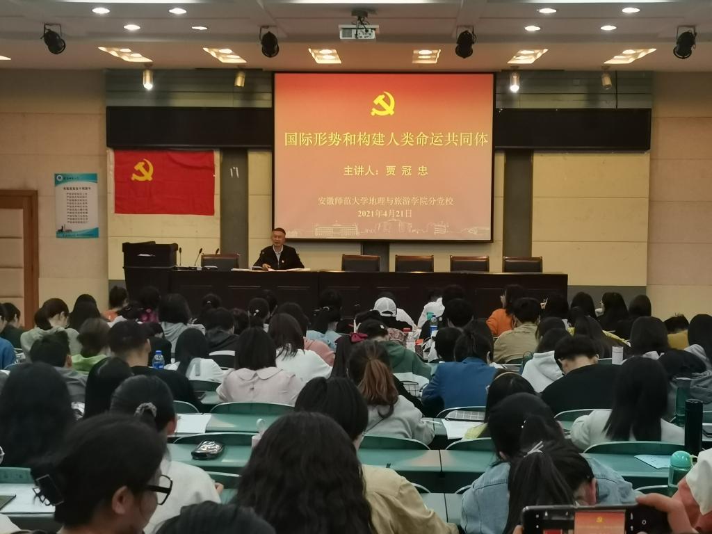 分党校第10期学生党员教育培训班、第61期大学生入党积极分子培训班在实验楼101报告厅如期展开,院党委书记贾冠忠为学员们作了题为“国际形势和构建人类命运共同体”的专题党课,全体参训学员参加培训,党课由副班主任齐小学主持。