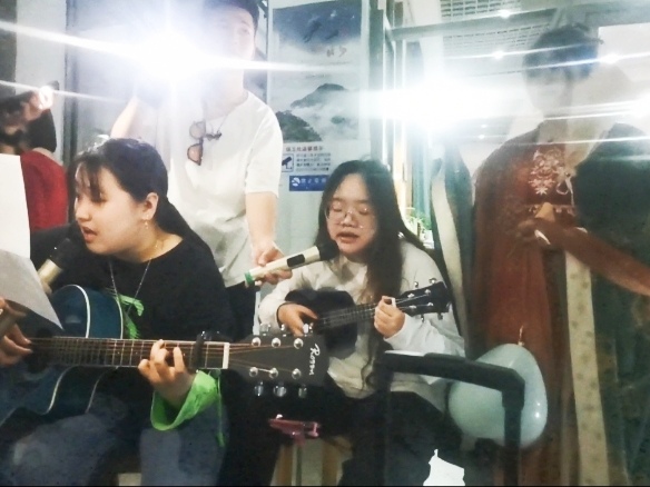 活动第二部分,由19旅管班同学带来热场节目流行歌曲串烧。在场的老师同学们纷纷打开闪光灯挥舞着与表演者一起合唱,实验楼洋溢着欢乐融洽的气氛。路过实验楼的老师同学们也受到吸引停下脚步,观看节目、购买钟意的商品。活动一直进行到20:30同学们才陆续散去。