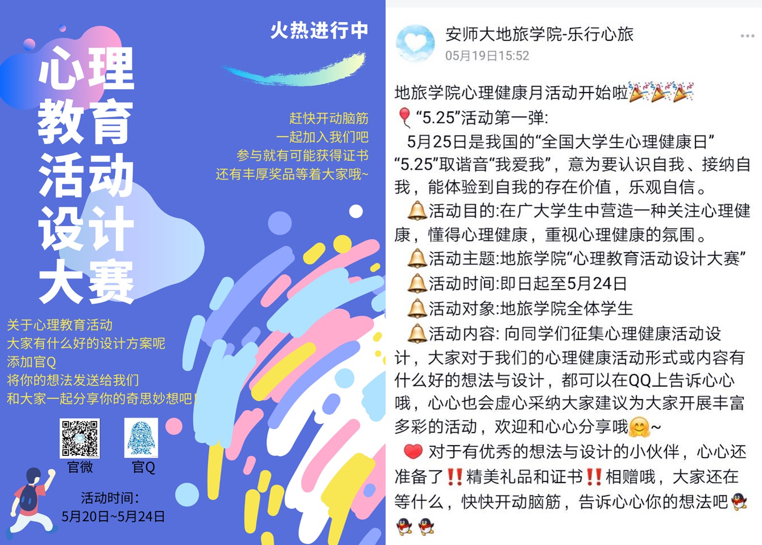 “乐行心旅”心理发展辅导站组织开展了心理健康活动设计大赛,同学们积极响应、踊跃报名,官Q账号收到大量创意方案投稿,有利于营造出女同做爱