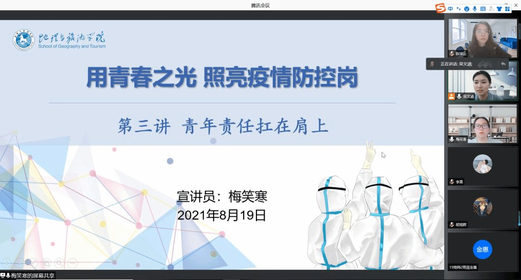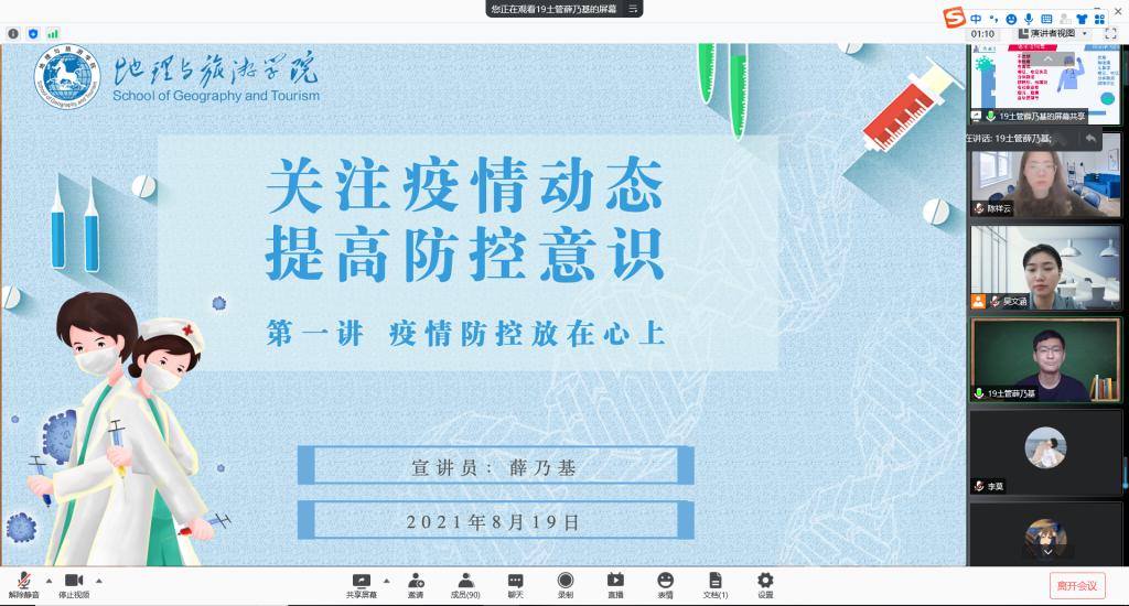2019级土地资源管理专业薛乃基同学作为第一讲主讲人为同学们科普了当前疫情形势以及关于新冠变异病毒的基础知识,通过形象的案例与直观的数据展示了疫情传播的严峻局面,同时提醒并呼吁广大青年做到疫情防控“六起来”——“思想严起来,出入严起来,疫苗种起来,口罩戴起来,聚集少起来,卫生抓起来”,有效提高防范意识,全面做好个人防护。