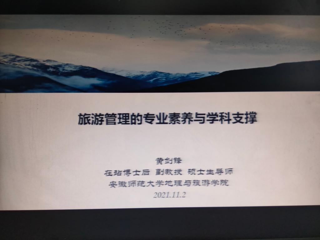 韦银艳 李炳臻)2021年11月2日下午,在地旅实验楼101报告厅,旅游管理专业教授王群、副教授黄剑锋为2021级旅游管理专业新生带来专业学习指导讲座。通过导师面对面传授个人大学学习经验和方式,帮助新生适应大学学习方式、提高学科素养、寻找学科支撑。讲座由王莉老师主持。