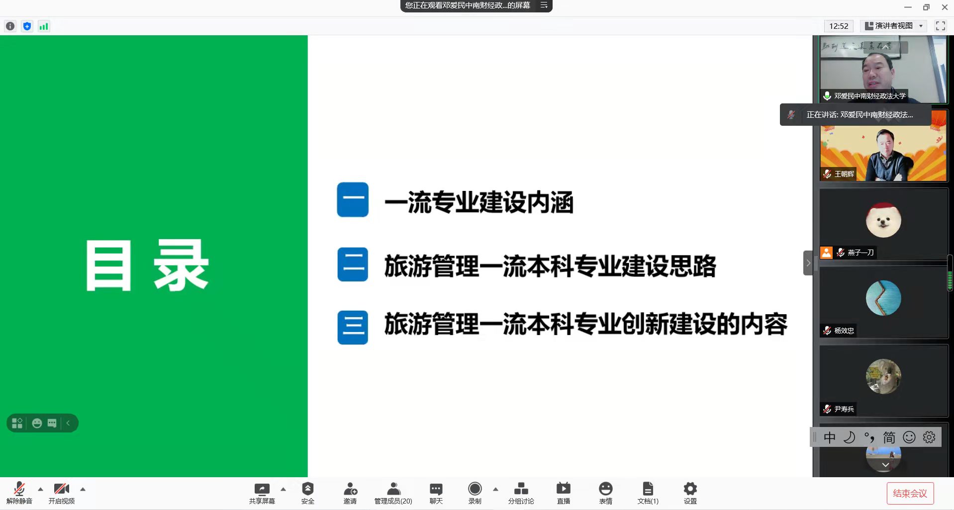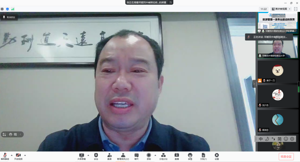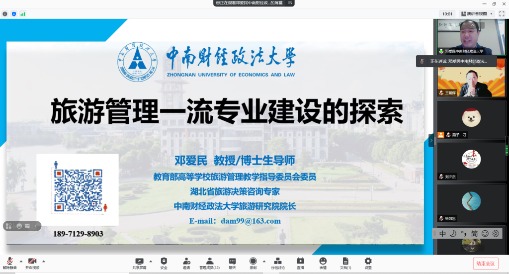 刘少杰) 2月26日上午,教育部高等学校旅游管理教学指导委员会委员、湖北省旅游决策咨询专家、中南财经政法大学旅游研究院院长邓爱民教授做客云端讲授《旅游管理一流专业建设的探索》专题辅导讲座,科研处副处长王朝辉、女同做爱