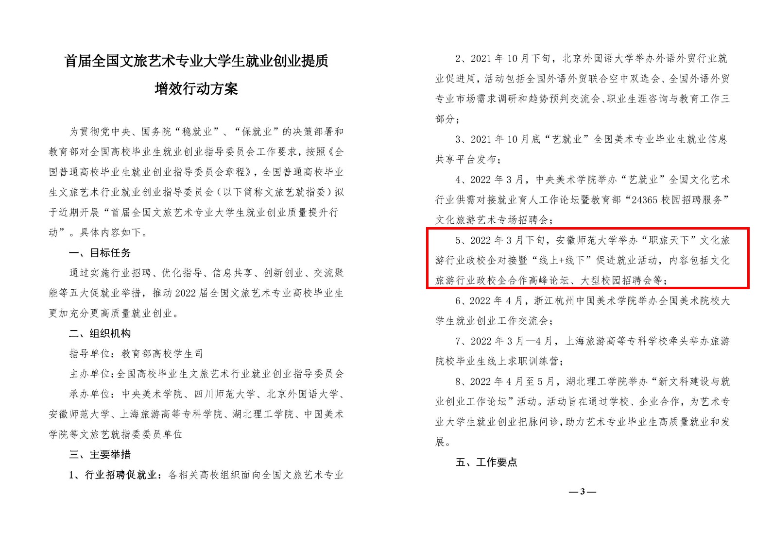 特色,优化内涵建设,细化招聘服务,引进优质单位资源,先后推出了安徽省第六届“职旅天下”文旅行业政校企对接暨长三角一体化“线上+线下”专场招聘会等多项举措,效果显著,有力推动了毕业生更加充分、更高质量就业。