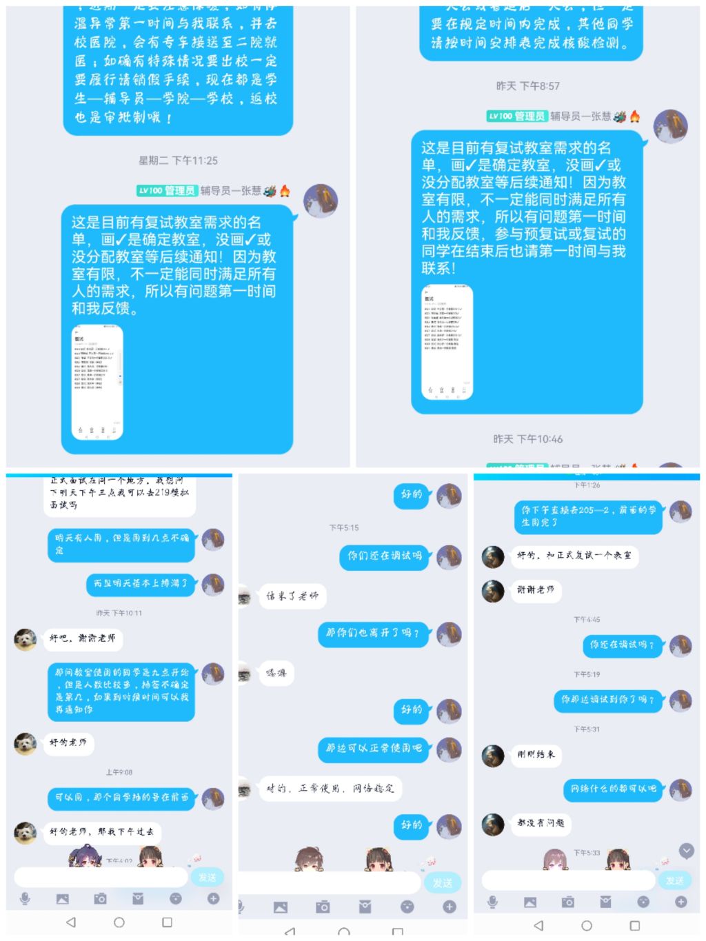 完成了6间考研复试教室的调配并投入使用,临近周末,线上复试需求增多,不仅新增了2间备用教室,帮扶老师和毕业班辅导员也纷纷表示可以将自己的办公室提供给学生,全院同步协商稳步推进考研学子预复试及正式复试工作。