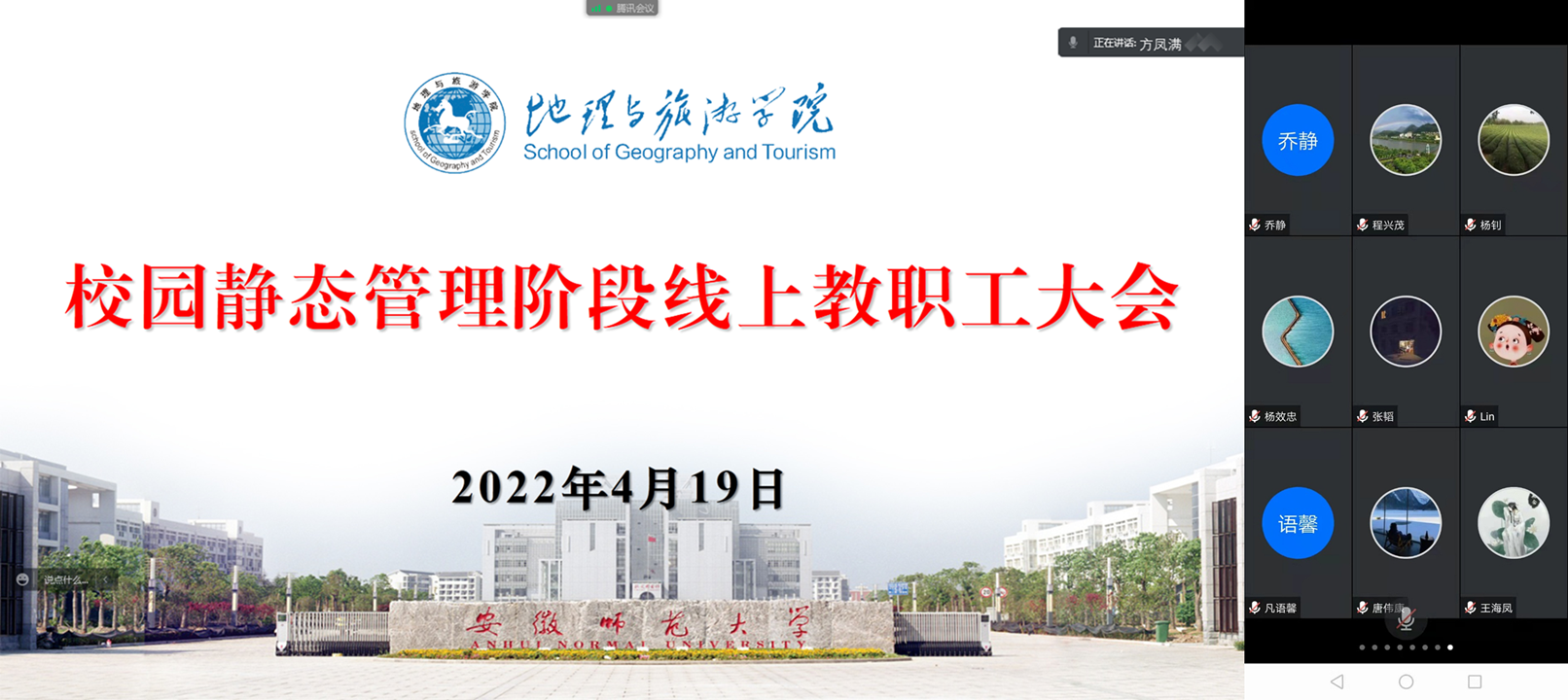 召开线上教职工大会,院党委书记贾冠忠、院长方凤满围绕校园静态管理下疫情防控、安全稳定、教学科研、学生管理、就业帮扶等工作做了重点部署,要求广大教职工提高政治站位,严明疫情防控工作纪律,严格遵守疫情防控各项规定,做到心态不乱、工作不断,为打赢疫情防控阻击战歼灭战做出积极贡献。