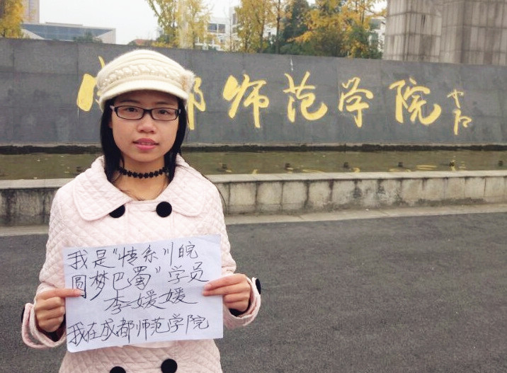 一幅名为“归雁”的照片上,一个笑容灿烂的女生手举一张卡片,卡片上写着:“我是‘情系川皖·圆梦巴蜀’学员李媛媛,我在成都师范学院”。
