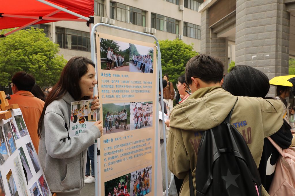 2020级地理科学专业维吾尔族学生苏热叶·热合曼正在向过往师生讲述着川队的故事。