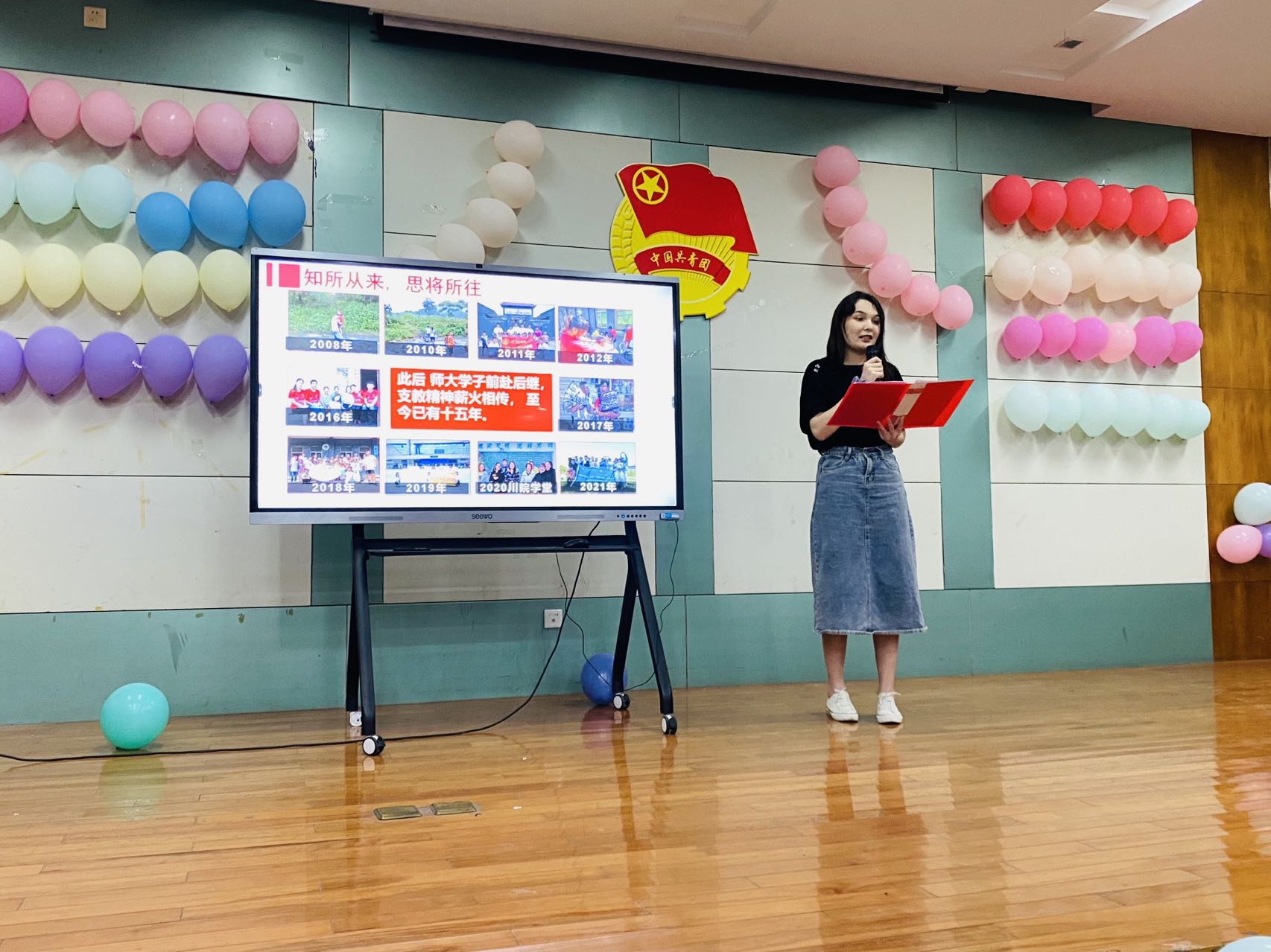 第三篇章:逐梦。乘风破浪,逐梦万里。由2021级地理科学(师范)专业丁心怡同学选送的歌曲《稻香》唱出了青年内心的坚强与自信,乐观与勇敢,寻找家的力量,给在外奔波的追梦人坚持下去的勇气。由2021级旅游管理专业选送的《少年中国说》歌颂了少年的朝气蓬勃,也唱出了当代中国青年发奋图强的精神风骨,勉励新时代青年要勇担重任,胸怀世界,不忘初心,不负时代。晚会在合唱《光荣啊,共青团》中落下帷幕,团员青年代表唱出了在党的领导下,广大青年坚定信心永远跟党走,在新时代新征程中勇毅前行、逐梦青春。