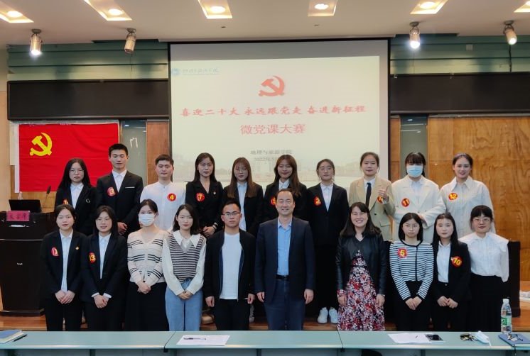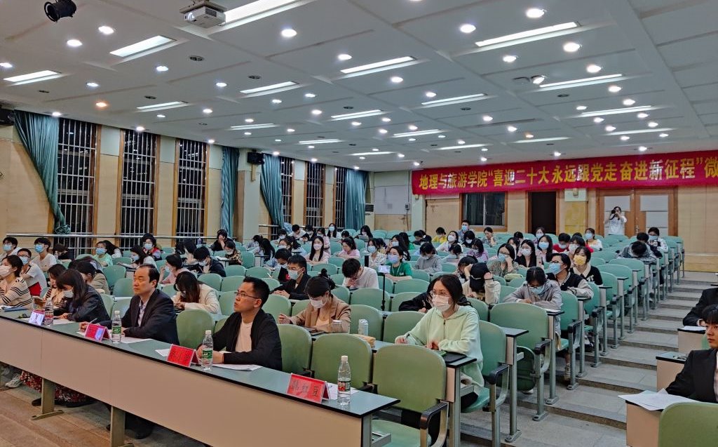 于院实验楼101报告厅举行“喜迎二十大,永远跟党走,奋进新征程”微党课大赛,院党委副书记、纪委书记乔静,院纪副书记王美,地理第一本科生党支部书记齐小学,以及女同做爱