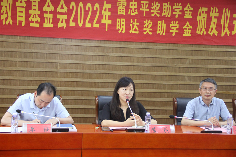 会议开始,乔静对陈琼行长的到来表示热烈的欢迎和感谢,并介绍了雷忠平奖助学金和明达奖助学金概况,宣读了颁发决定,对获奖受助学生表示祝贺。他强调,希望获奖同学珍惜荣誉、再接再厉、勤奋学习、发奋成才,争取更大成绩。随后,陈琼、贾冠忠、乔静等为获奖受助学生代表颁发获奖证书并合影留念。