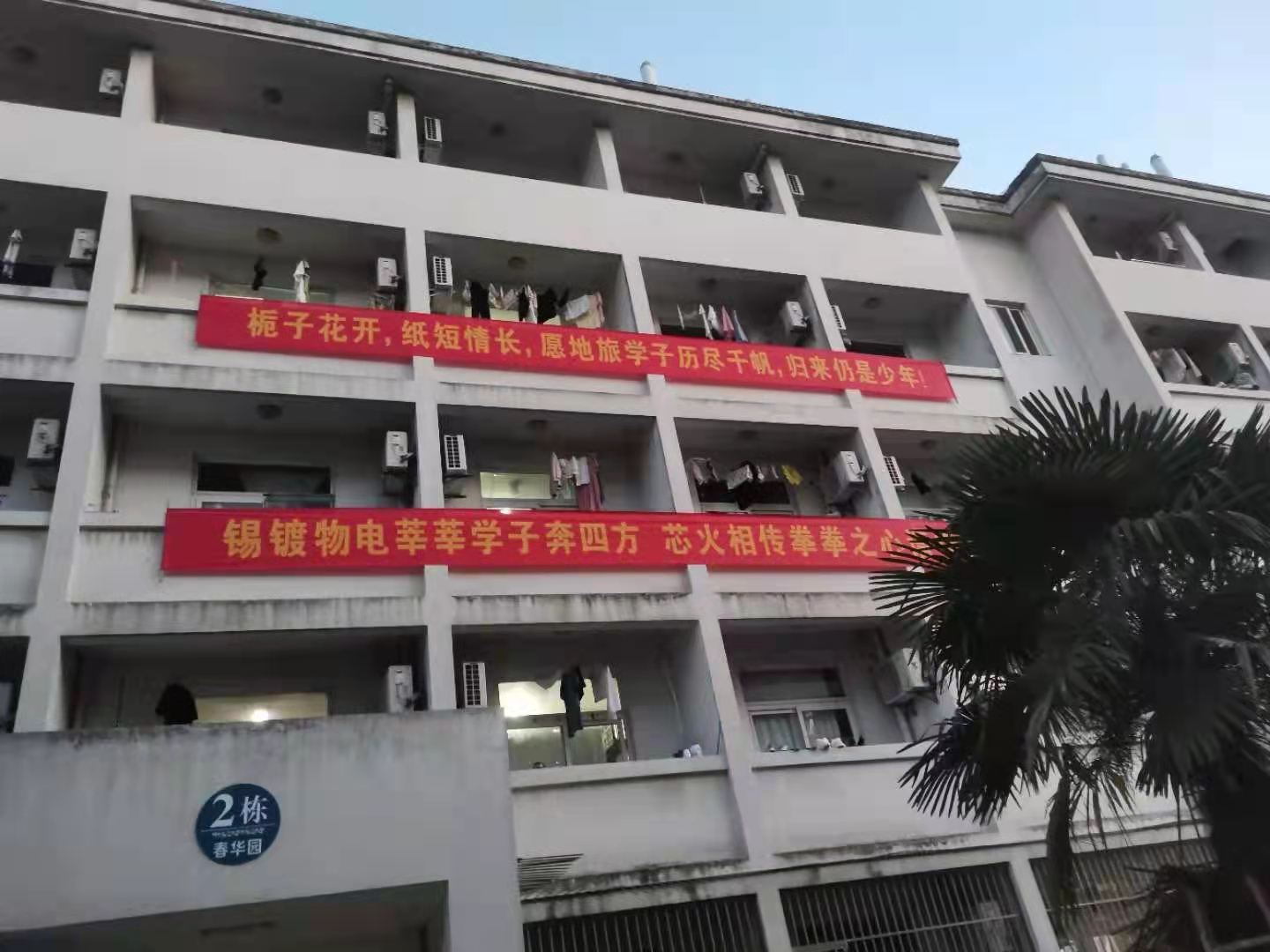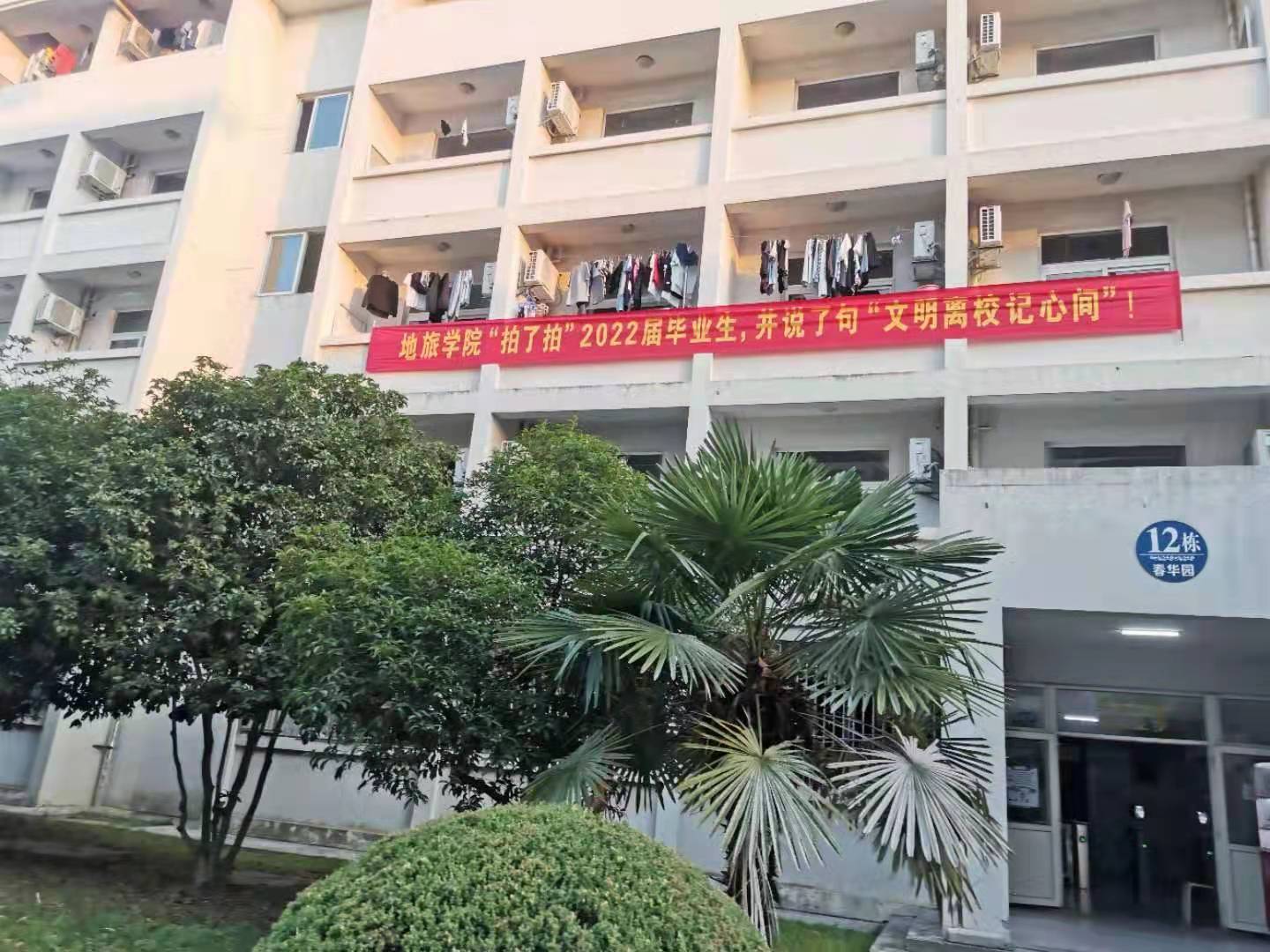 行政楼、实验楼悬挂毕业寄语横幅,营造温情毕业季氛围。