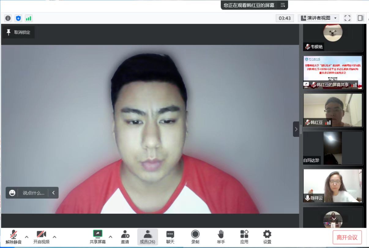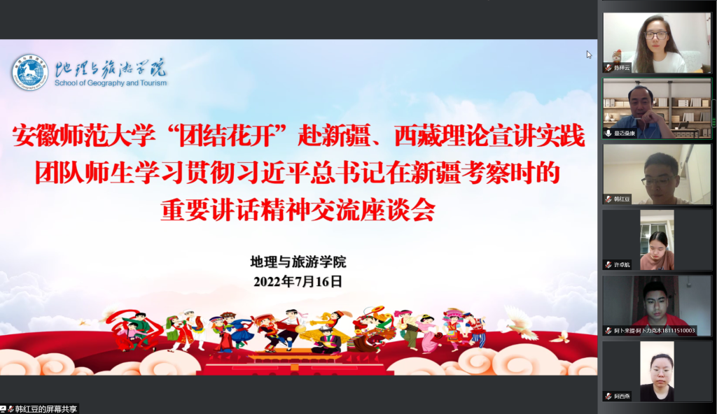 积极行动,组织该院国家级暑期社会实践重点团队——安徽师范大学“团结花开”边疆少数民族学子赴新疆、西藏理论宣讲实践团队的师生,通过线上开展学习贯彻习近平总书记在新疆考察时的重要讲话精神交流座谈会,女同做爱