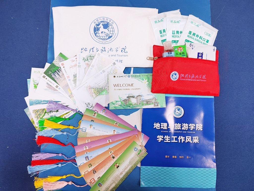 定制LOGO及院训的入学纪念帆布袋,装有口罩、酒精消毒湿巾、免洗手消毒凝胶、定制红色便携包的防疫包、城乡规划专业特色手绘师大风景明信片、导师推荐阅读书目和新生寄语的定制书签一套、女同做爱