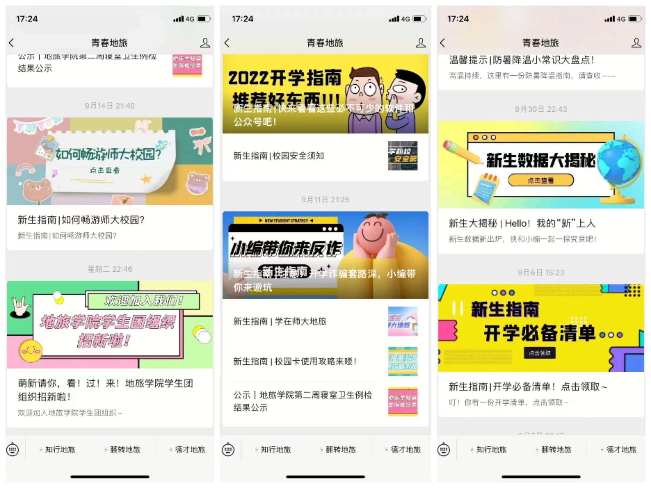 学生工作风采;“线上大礼包”则是通过青春地旅微信公众号推送,涵盖“入学须知”、“防疫知识”“校园卡使用”、“防电信诈骗”等内容丰富的新生“电子大礼包”。