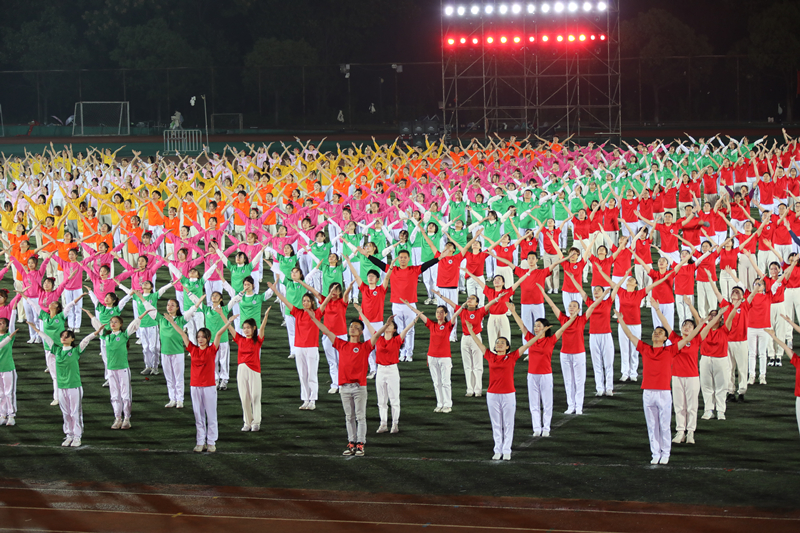 高歌曼舞传扬体育精神。文艺表演环节百花齐放,惊喜不断。舞龙表演威风凛凛,气势磅礴。百余名师生制作80余只非遗鱼灯,舞活一幅鱼灯国画。民族健身舞《梦圆中国》激情四射、《少年中国说》武术表演意气风发、拉丁舞《时代青春》动感十足。在千人齐舞《一起向未来》表演中,女同做爱