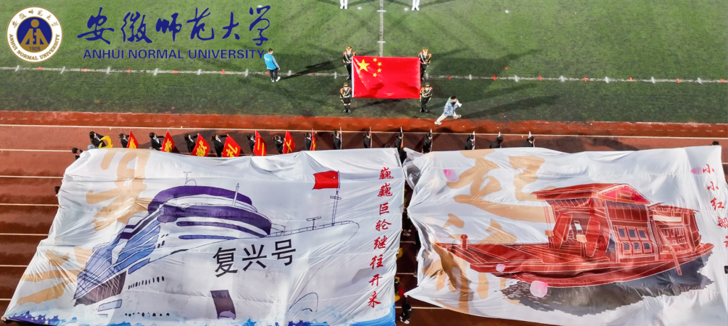 方阵率先入场,步伐坚定,气势如虹,激情豪迈,以热情饱满的姿态向全校师生展示地旅学子昂扬向上的精神风貌。“经天纬地,弘道明理,青春向党,勇毅前行!”响彻全场的口号昭示着地旅必胜的决心。富有专业特色的荧光地球被高高举起;身着绚丽服饰的少数民族同学别具一格,围成一圈载歌载舞,彰显了民族团结的和谐气象;礼仪队身着红色旗袍流转光华,退伍学生身披绿色军装英姿飒爽。主席台前,地旅学子以鲜艳的展板,流动的巨幕献礼二十大,一幅图卷徐徐展开,一艘红船在穿越历史沧桑巨变后终成巍巍巨轮的壮阔历程跃然于纸上,体现了地旅学子始终坚定理想初心,付绚丽韶华汇入新时代的浪潮,永远跟党走,奋进新征程,以饱满自信的精神面貌做出“青春奋斗,强国有我”的承诺,彰显了新时代青年的使命担当。