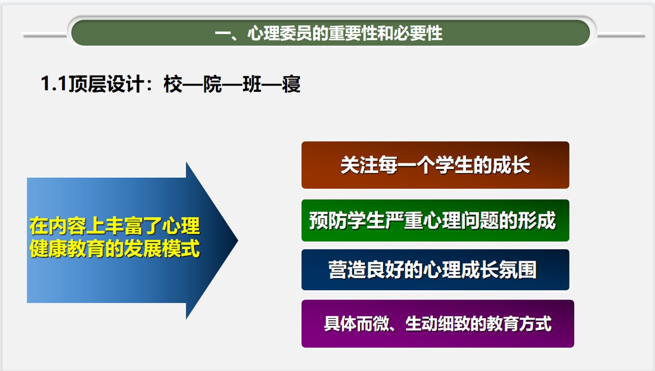 高度重视大学生心理健康教育,始终坚持围绕学生、关照学生、服务学生,遵循大学生心理发展规律,按照全员化、全程化、信息化、专业化要求,把日常心理关怀和重要节点教育贯彻学生学习全方位全过程,不断丰富教育活动、形式和载体,注重把握心理健康教育最新诉求,做深做实心理健康教育,取得了扎扎实实的成效。