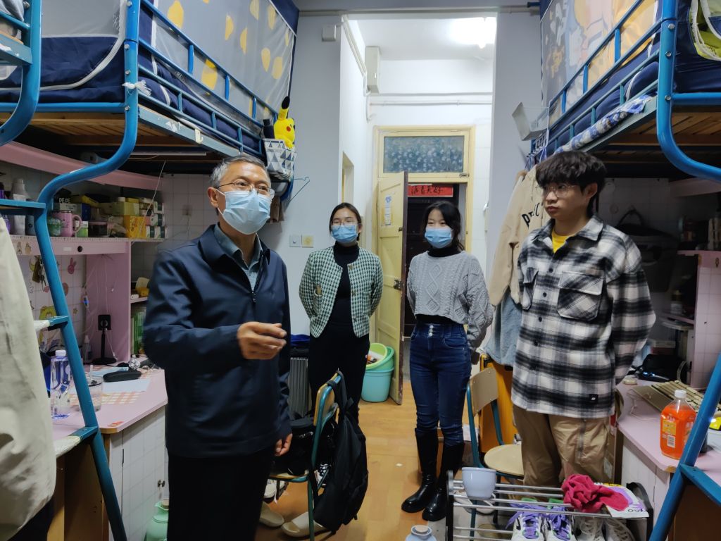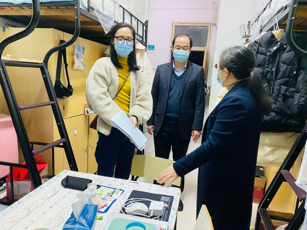 实验楼、学生宿舍等教学生活场所,走访看望在校学生,了解学生最新思想动态,全面排查疫情防控、安全卫生等情况,重点检查了本科生、研究生的核酸检测、晨午晚检、健康打卡、安全签到等疫情防控要求落实情况,随机抽查了部分学生健康码、行程码,并叮嘱学生要牢固树立个人是疫情防控第一责任人的意识,理解支持属地和学校疫情防控政策。指导学生针对检查过程中发现的安全隐患,现场进行整改。