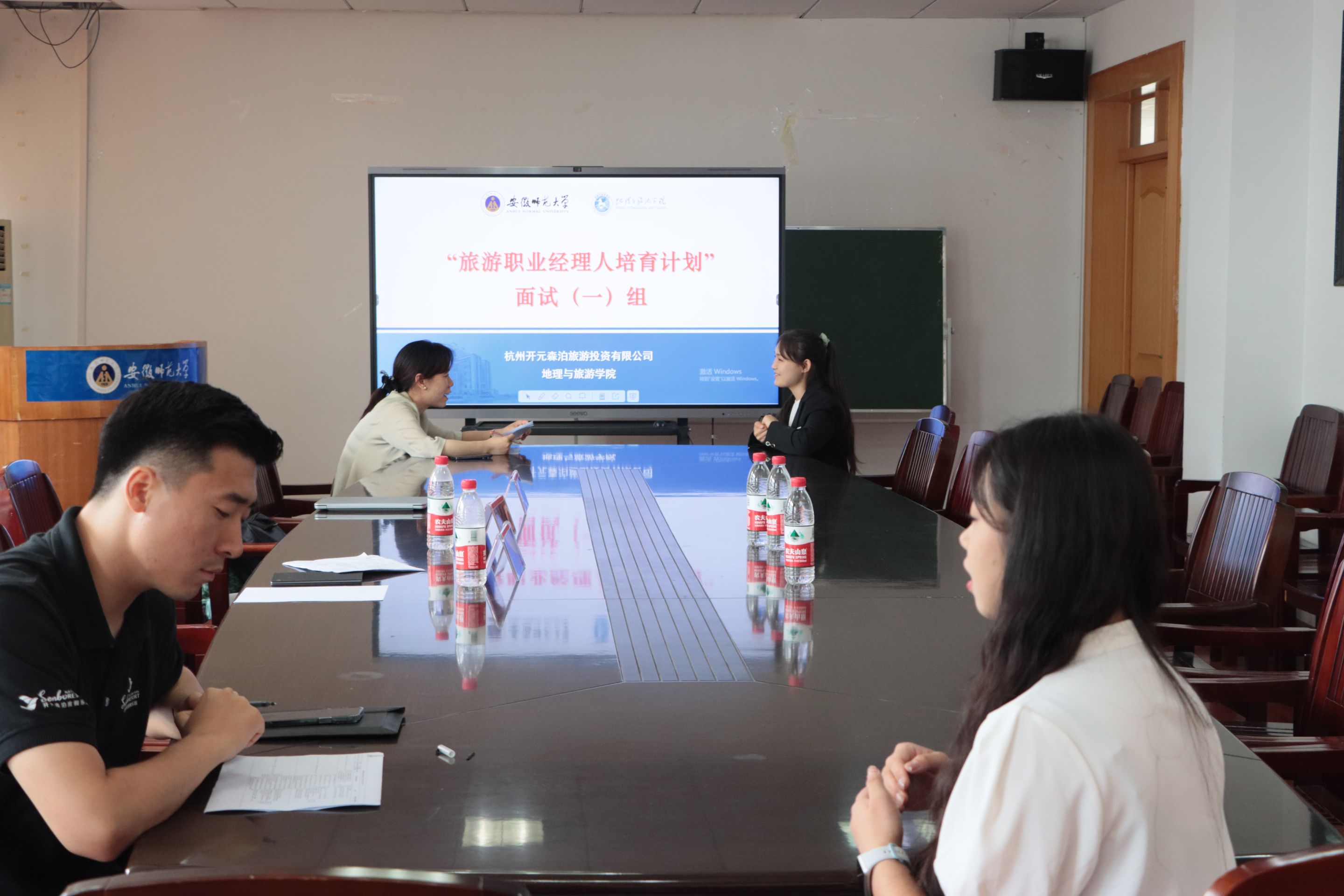 宣讲结束后,由开元酒店代表开展“旅游职业经理人培育计划”人才招募面试。面试分为三组,同时对28位同学开展自我介绍、职业理念、个人规划等方面的考察。经过层层筛选,最终10位学生参加首届“旅游职业经理人培育计划”。