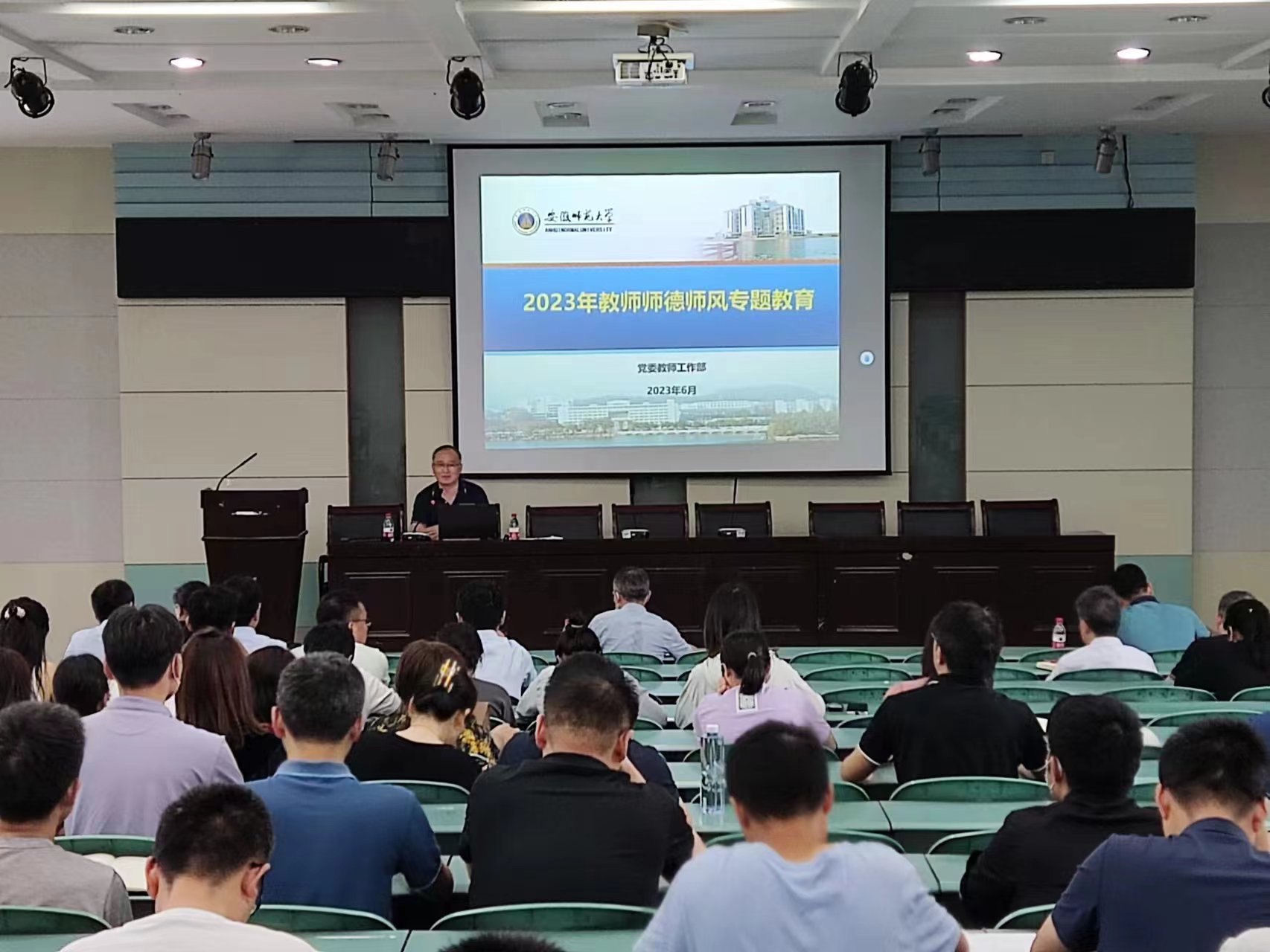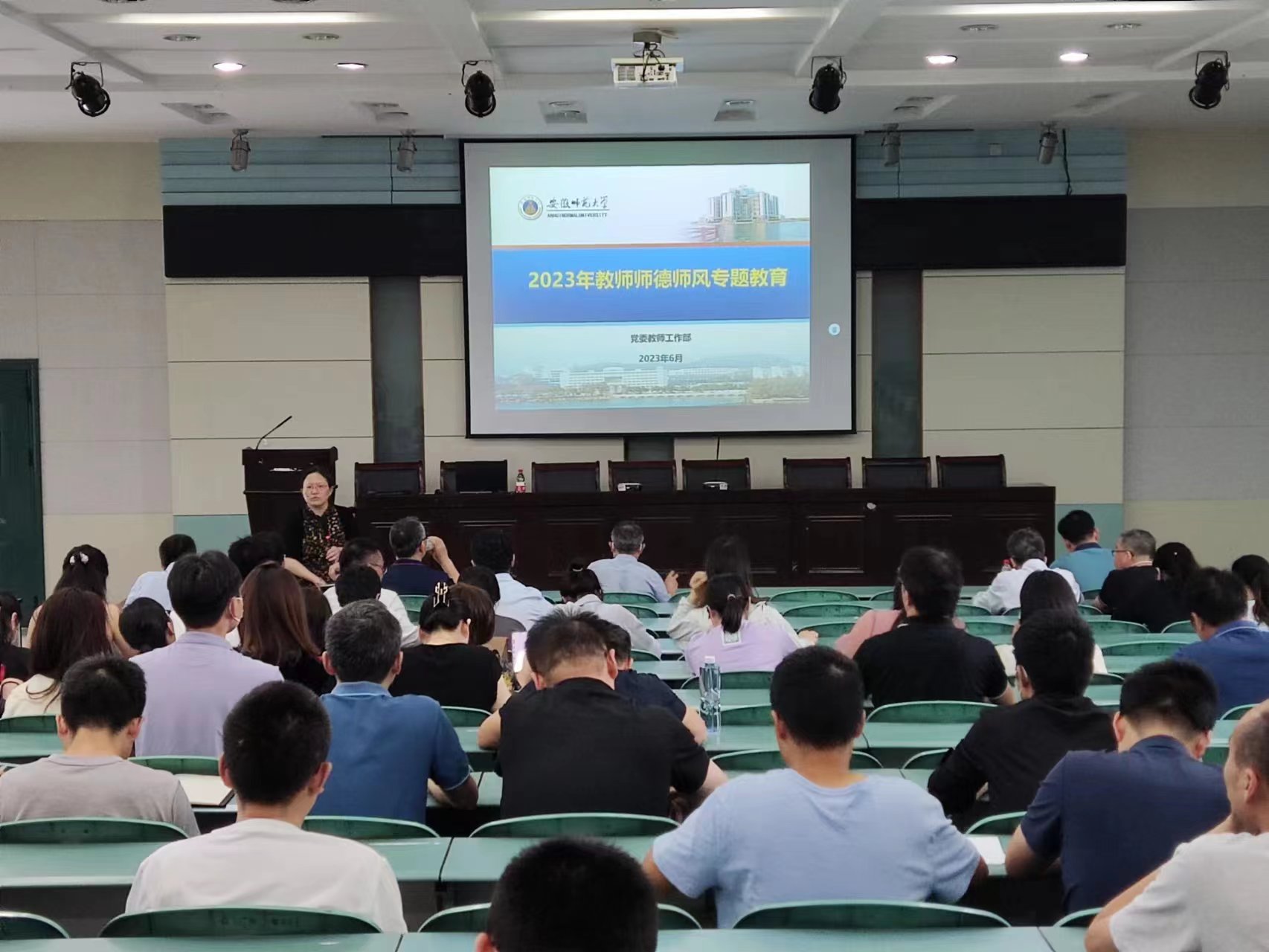 在院实验楼101报告厅召开全院教职工大会暨师德师风专题教育。校人事处副处长王标受邀作2023年教师师德师风专题报告,院长方凤满主持,女同做爱