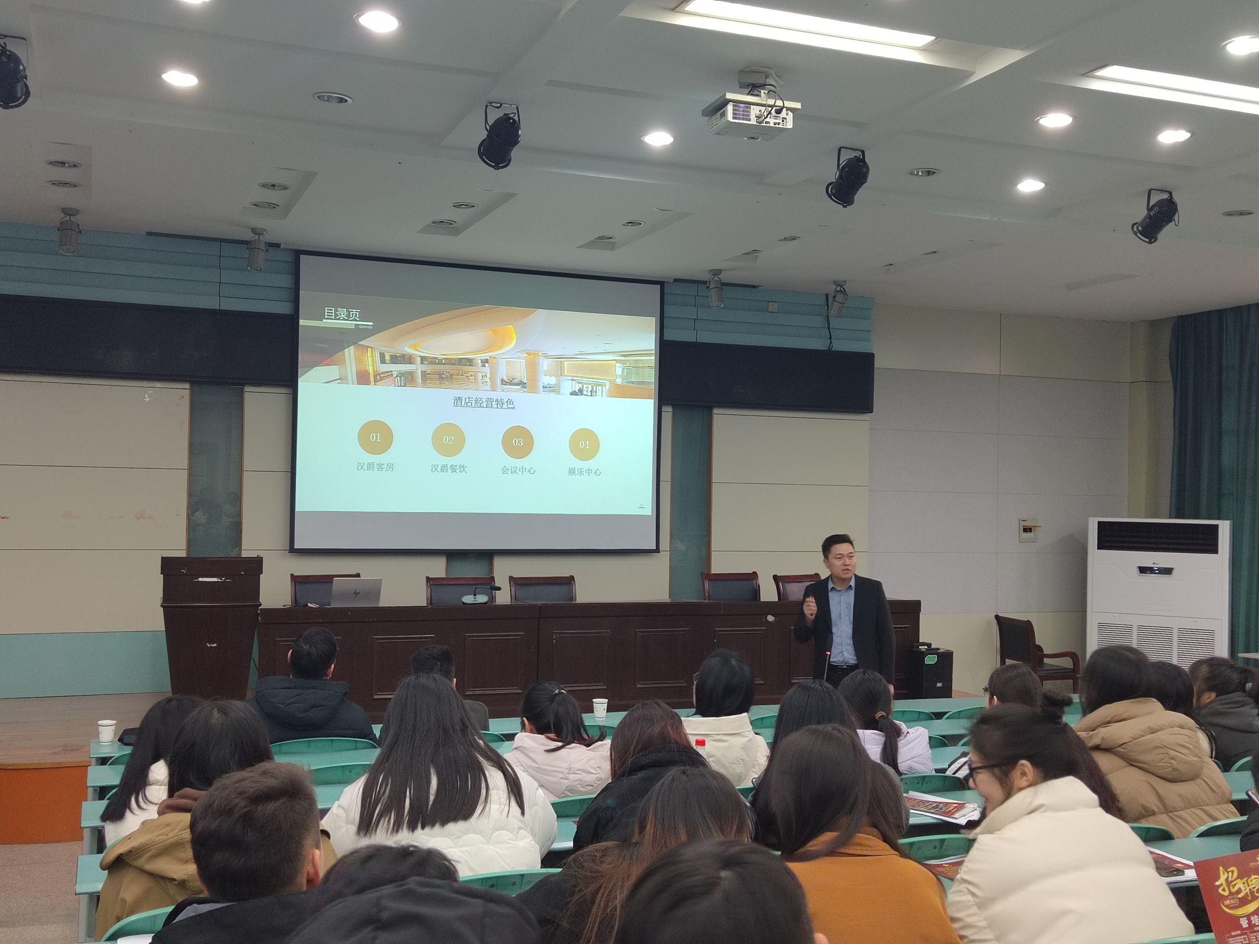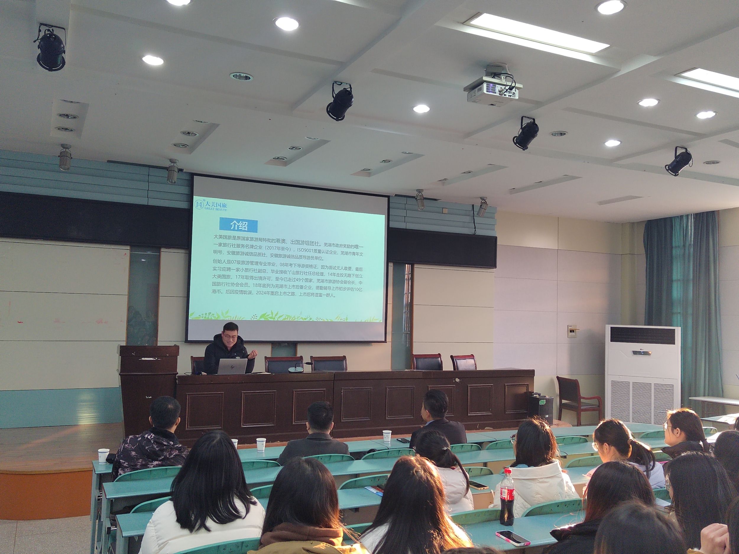 为充分发挥校友资源,深化朋辈教育引领就业,旅游管理专业邀请杭州博行达观文化发展有限公司总经理张松、芜湖汉爵阳明大酒店总经理年磊、安徽大美国际旅行社有限公司总经理邢之鹏三位2011届旅游管理专业校友、现任开元森泊度假区招聘专员的2022届刘浩桐、2023届程杨两位校友前来开展招聘宣讲。校友们结合自身创业、就业经历,向同学们介绍了未来职业发展的可能性和需要思考的问题,同时积极宣传本单位招聘岗位,鼓励毕业生们积极加入。