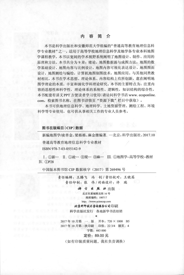 为了适应地理信息科学等专业本科地图学课程教学需要,编写出具有实用性、科学性、时代性的教材,科学出版社和安徽师范大学策划编写出版“普通高等学校地理信息科学专业本科系列教材”,《新编地图学》是其中的一部,也是第一部,由本院教师凌善金、梁栋栋、麻金继共同编著,凌善金还专门为该书题写了书名。本书共44.3万字,于2017年10月由科学出版社正式出版。该书共分为九章,分别为绪论、地图数据源与成图方法、地图数学基础设计、地图内容与比例设计、地理信息的可视化表达设计、地图图面设计、地图编绘与测绘、计算机地图制图技术、地图应用。为了方便教学,作者还专门为此教材精心设计制作了电子教案,由出版社免费发行。