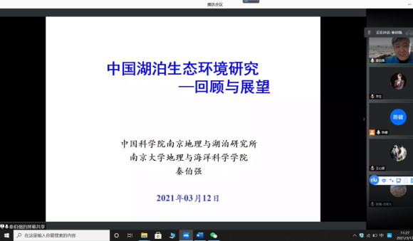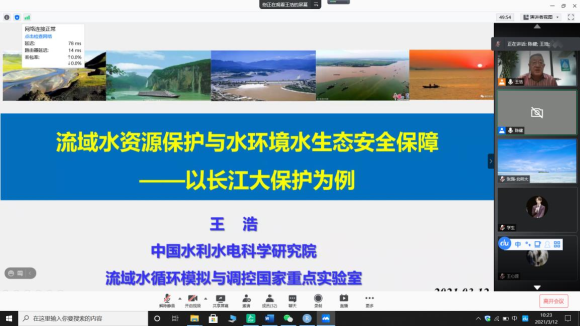 院长苏勤教授感谢学术委员会各位委员在百忙之中抽出时间对江淮流域地表过程与区域响应安徽省重点实验室的工作进行指导,对与会专家就重点实验室的建设和发展提出的宝贵建议表示感谢。随后,王浩院士和秦伯强研究员分别做了“流域水资源保护与水环境水生态安全保障——以长江大保护为例”和“中国湖泊生态环境的研究-回顾与展望”的特邀报告,介绍了近期的重要科研成果。部分青年教师和地理学全体研究生通过线上和线下方式聆听了报告。两场报告内容精彩纷呈,尤其是对长江大保护面临主要问题和湖泊科学领域研究热点与前沿的分析对重点实验室未来的建设与发展有很好地指导作用。