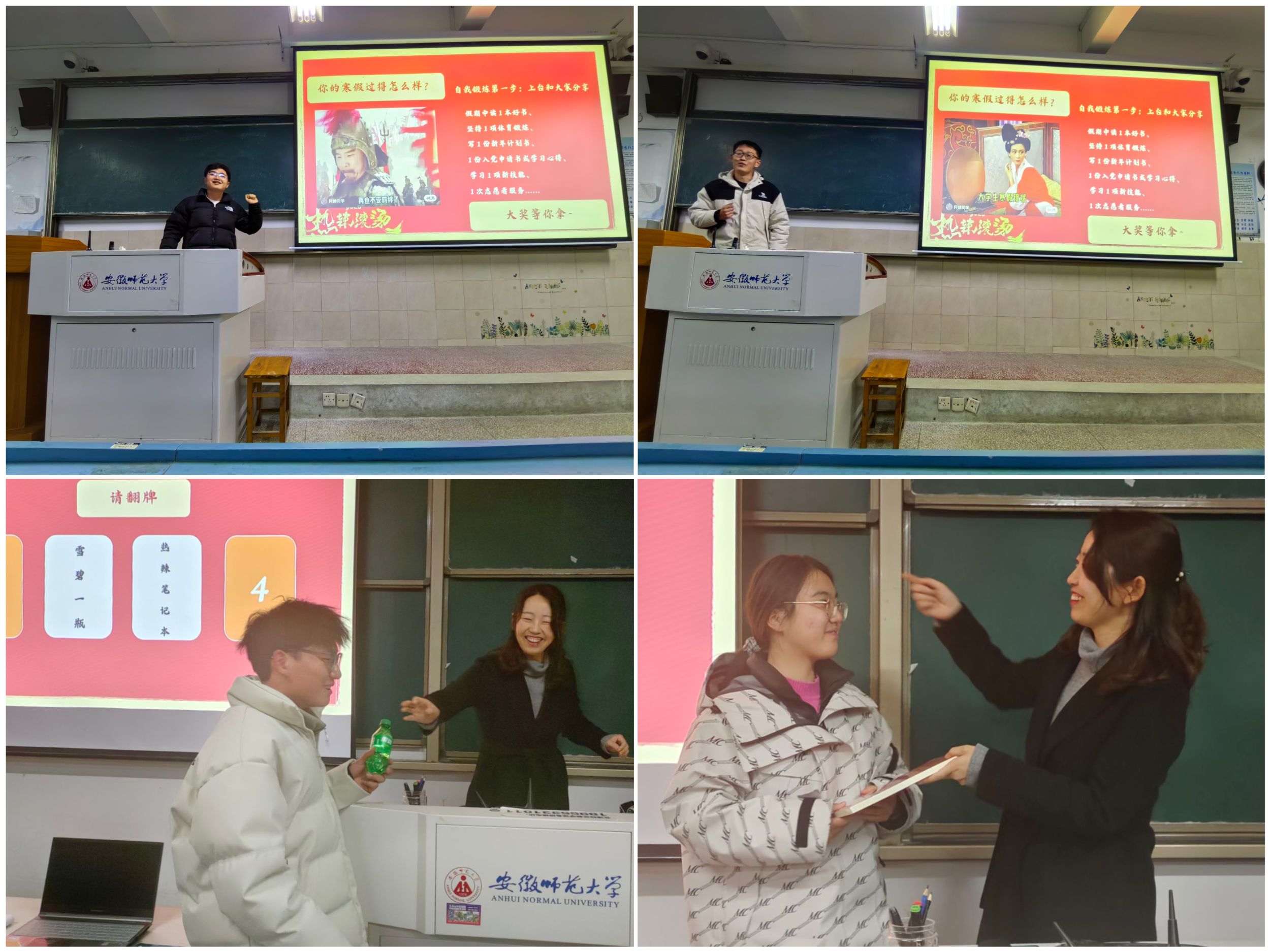 为了让同学们合理规划寒假生活,李老师在放假前给大家布置了一份寒假小作业。会议伊始,大家踊跃上台讲述寒假中的成长、收获和经历:给家人做一顿年夜饭、参加社区图书馆志愿者服务、和家人一起旅行、读一本好书、学一门技能、坚持健身……分享环节气氛热烈,展示了同学们丰富且有意义的寒假生活。李老师也为发言的同学们颁发了奖品表示肯定和鼓励。