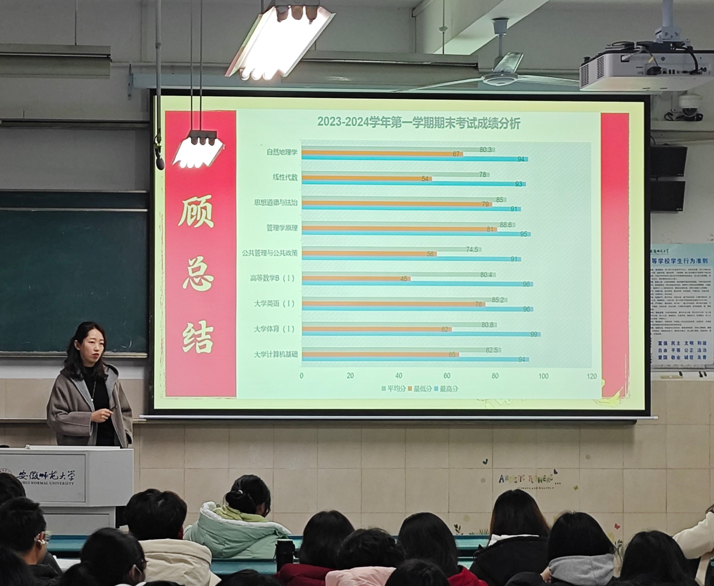 随后,李老师以图表的形式分析了各班上一学期期末考试成绩情况,督促大家回顾过往、主动收心,并在新学期制定新目标新计划,重新规划接下来的学习和生活;希望同学们放开想、仔细听、大声说、规范做,养成课前预习、课中积极、课后复习的好习惯;鼓励同学们走出寝室,积极参加户外活动,锻炼身体、加强沟通交往能力。