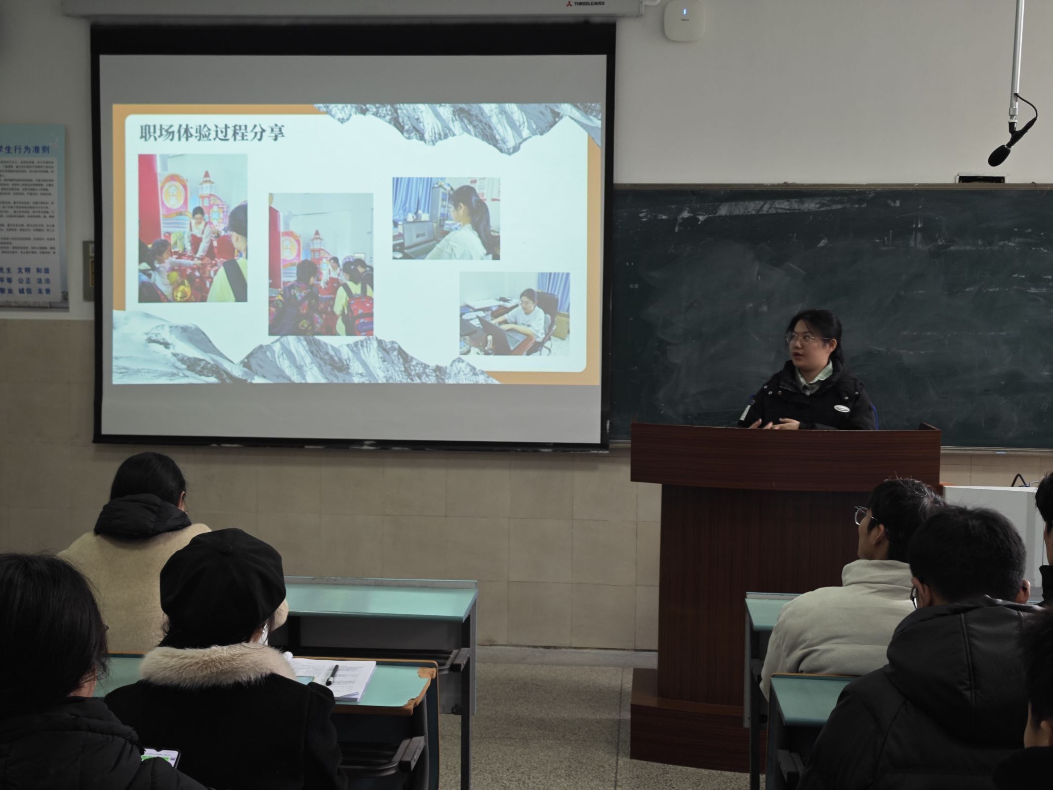 挺膺担当,‘职’面未来”。王冰冰、许毅俊同学分享了自己在地方政府当实习生的故事,体验职场的同时积极为人民服务,助力家乡发展,让同学们看到了当代青年服务人民、回报家乡的责任感与使命感。