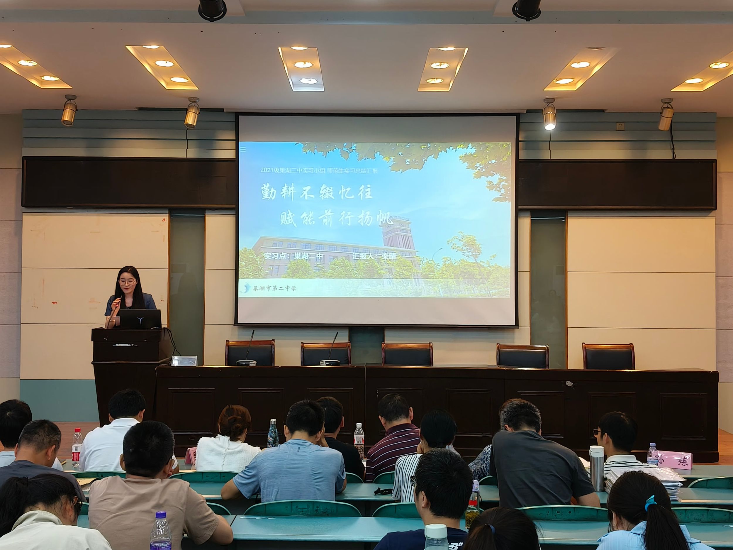 会议开始,各实习组分别就组内分工情况、实习准备、实习进展、实习成果以及存在的问题等方面进行了详细汇报。同时,各小组结合教育实习的切身经历分享了近三个月实习的收获与感悟、反思与进步,并对校内外指导老师在实习过程中的热心指导表示感谢。实习过程中,同学们严格遵守实习纪律、圆满完成了各项实习任务,既有辛苦付出,同时又收获满满,充分展示了师大学子的良好形象。其中,南陵一中实习组共计授课432节,授课量位居第一;巢湖二中实习组连续两个半月全程参与班主任实习,每天早上六点起床和学生同作息共成长。汇报结束后,现场评委根据各小组的现场汇报和综合表现评选出优秀实习小组,并为获评优秀实习小组和优秀实习生的同学颁奖。