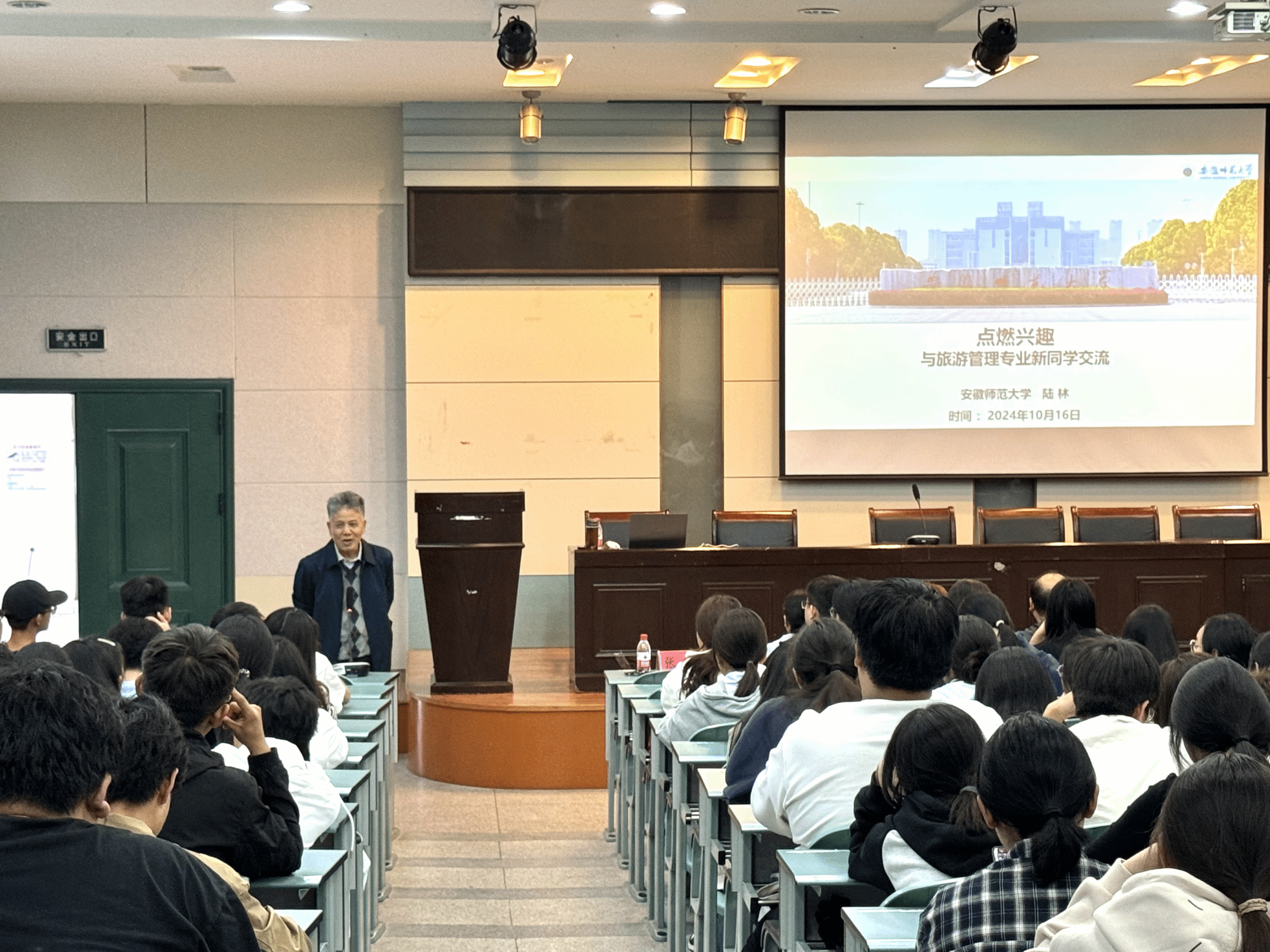 随后,中国第一位旅游学博士后、中科院地理所博士后、安徽师范大学原副校长陆林教授以“点燃兴趣”为主题给同学带来了一场精彩纷呈的讲座。陆林以生动的案例,从新时代、硬实力、软实力、价值共创四个方面深入浅出地剖析了旅游管理专业具备的优势与发展前景,强调我们正处于一个高质量发展的新时代,广大青年要争做有理想、敢担当、能吃苦、肯奋斗的新时代好青年,在推进强国建设、民族复兴伟业中展现青春作为、彰显青春风采、贡献青春力量,奋力书写为中国式现代化挺膺担当的青春篇章。