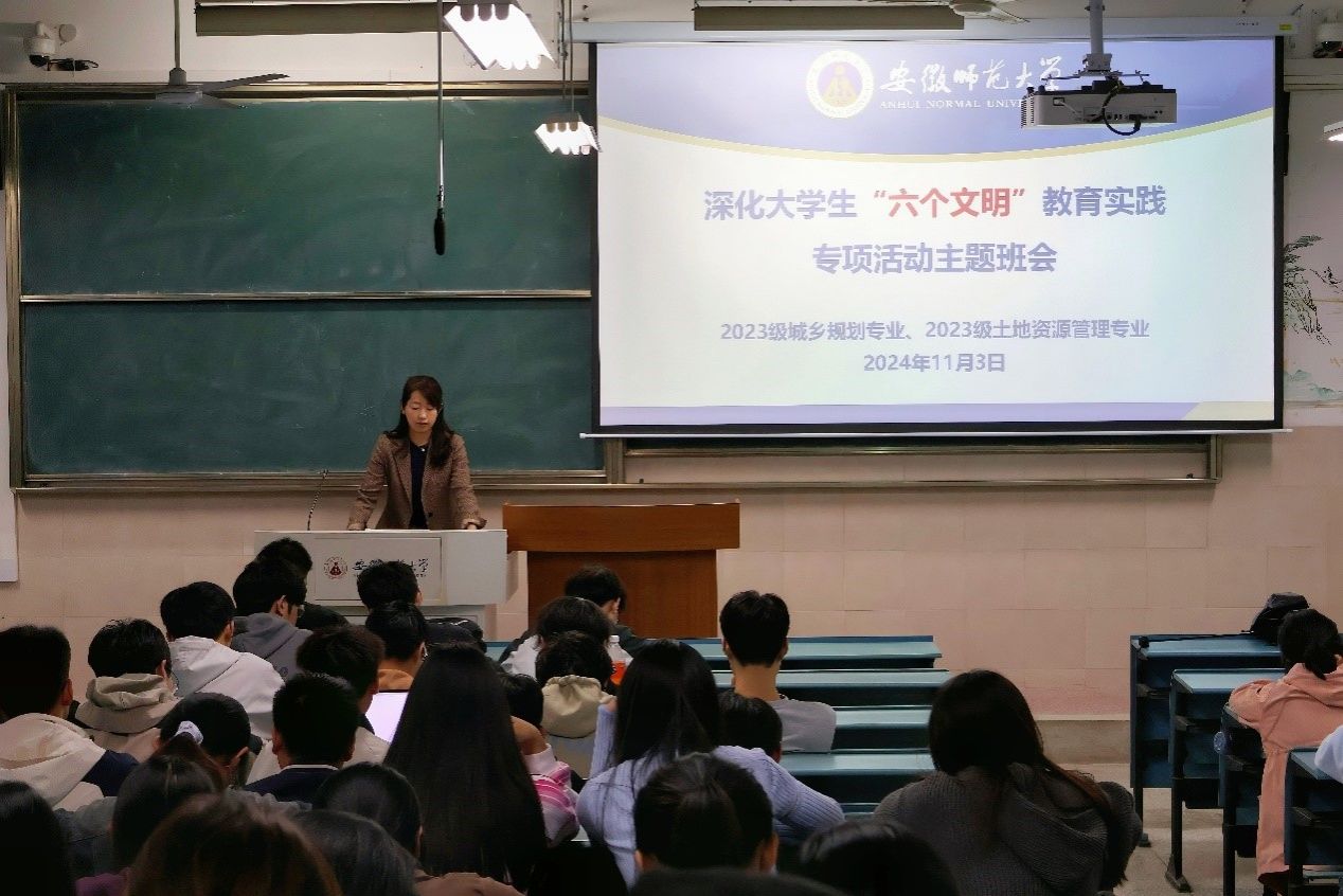 2023级城乡规划和2023级土地资源管理专业在2050303教室召开了深化大学生“六个文明”教育实践专项活动主题班会及本科生教育教学评估学生迎评动员大会。本次会议由辅导员李婷君主持,2023级城乡规划和2023级土地资源管理全体同学参加。