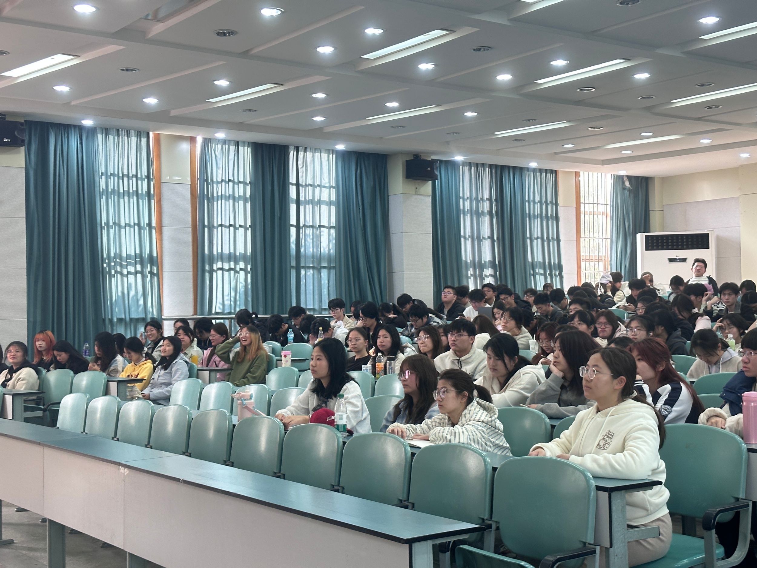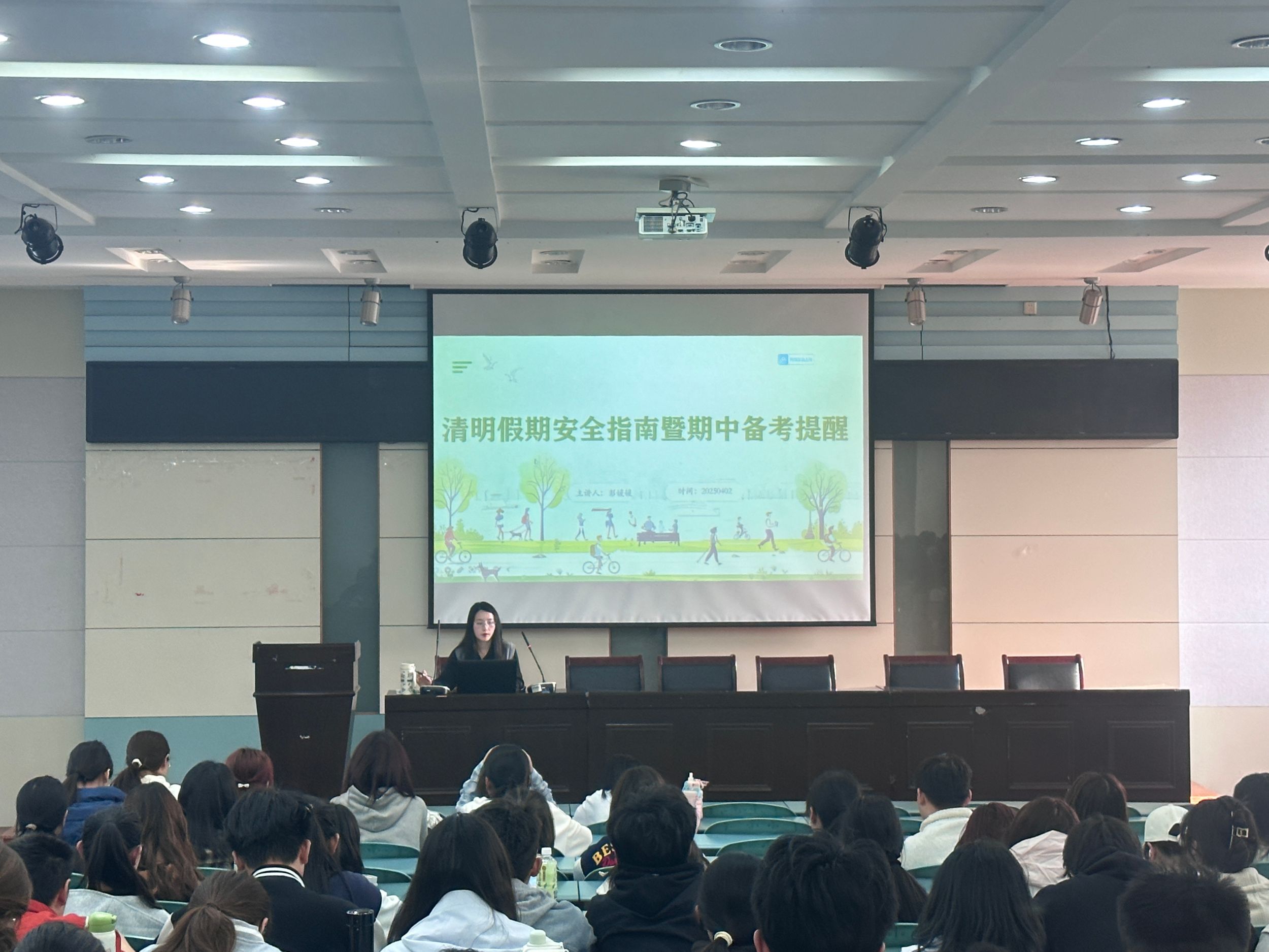 实验楼101报告厅召开关于清明假期安全的主题班会。此次班会由辅导员彭媛媛主持,各专业全体学生参与。