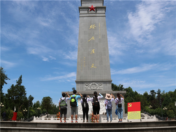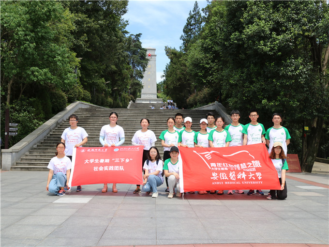 积极进取才是最好的告慰。经过一夜的修整,队员们元气满满地来到了实践的第二站——金寨县红军广场。金寨县位于大别山革命老区脚下,是新四军的主要发源地。先后10万金寨儿女参军参战,1万余名革命烈士以及59位获授军衔的金寨籍将军,共同造就了金寨“将军县”的名号。红军广场由广场,纪念碑,纪念堂,烈士陵园和革命博物馆等部分组成。团队一路拾阶而上,两旁松柏静默而立,每一步都是缅怀。作为当代大学生,队员们自发在纪念碑前庄严宣誓,立志学好专业知识,为祖国发展添砖加瓦,以慰先烈。夏日骄阳下的金寨闪着金色的光芒,每一处的安详平和里仿佛都看得见先烈们的微笑。实践途中,团队还巧遇了同样前来实践的安徽医科大学兄弟团队,志同而气合,两团队进行了友好交流并合影留念。