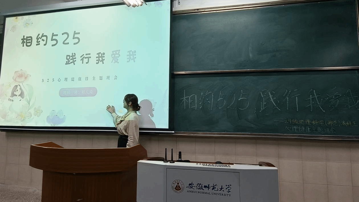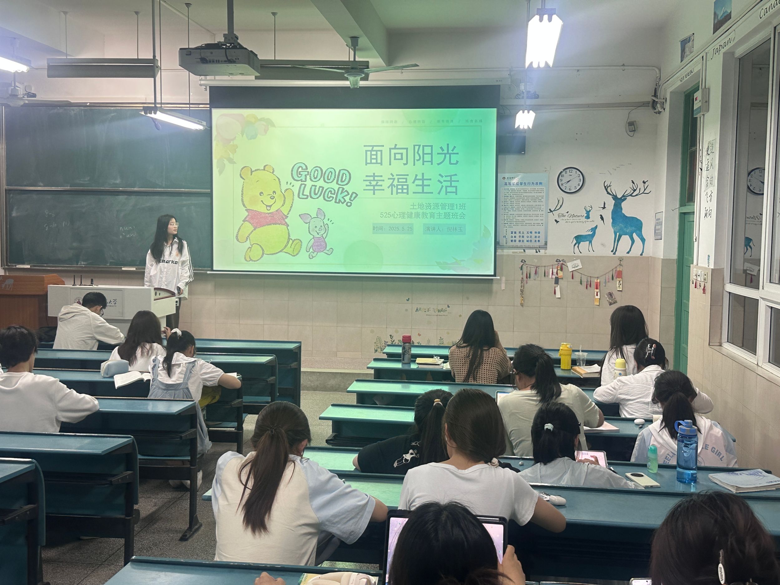 刘紫凤、何诗雨、曹文瑾、万思琪)5月25日,为了普及心理健康知识,增强学生的心理调适能力,2024级地理科学(师范)、土地资源管理和城乡规划专业分别在各自教室成功举办了以“相约525 践行我爱我”、“面向阳光 幸福生活”、“每一个当下的你,都是最好的你”和“悦纳自我 关爱心灵”为主题的系列心理健康主题班会。