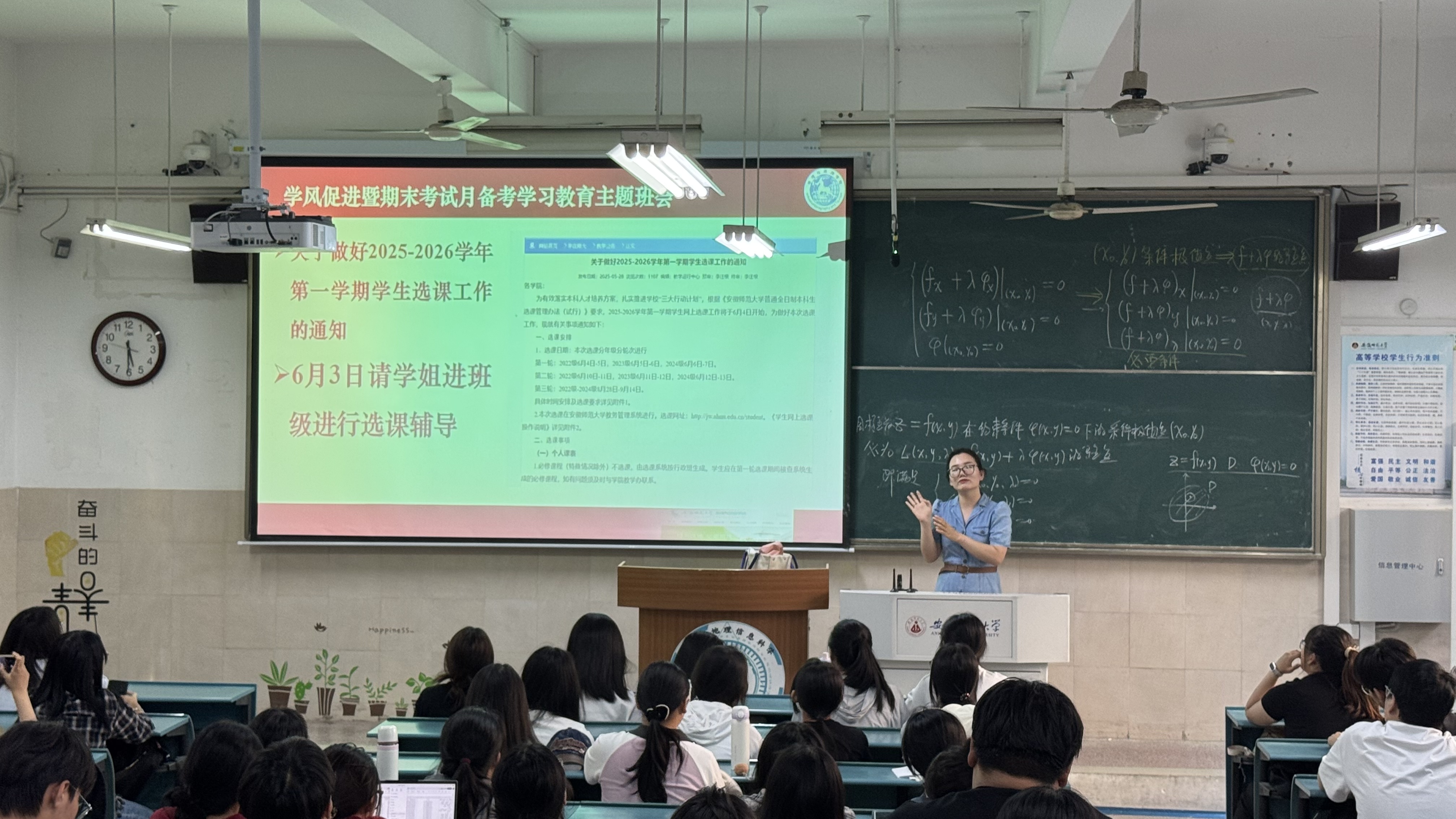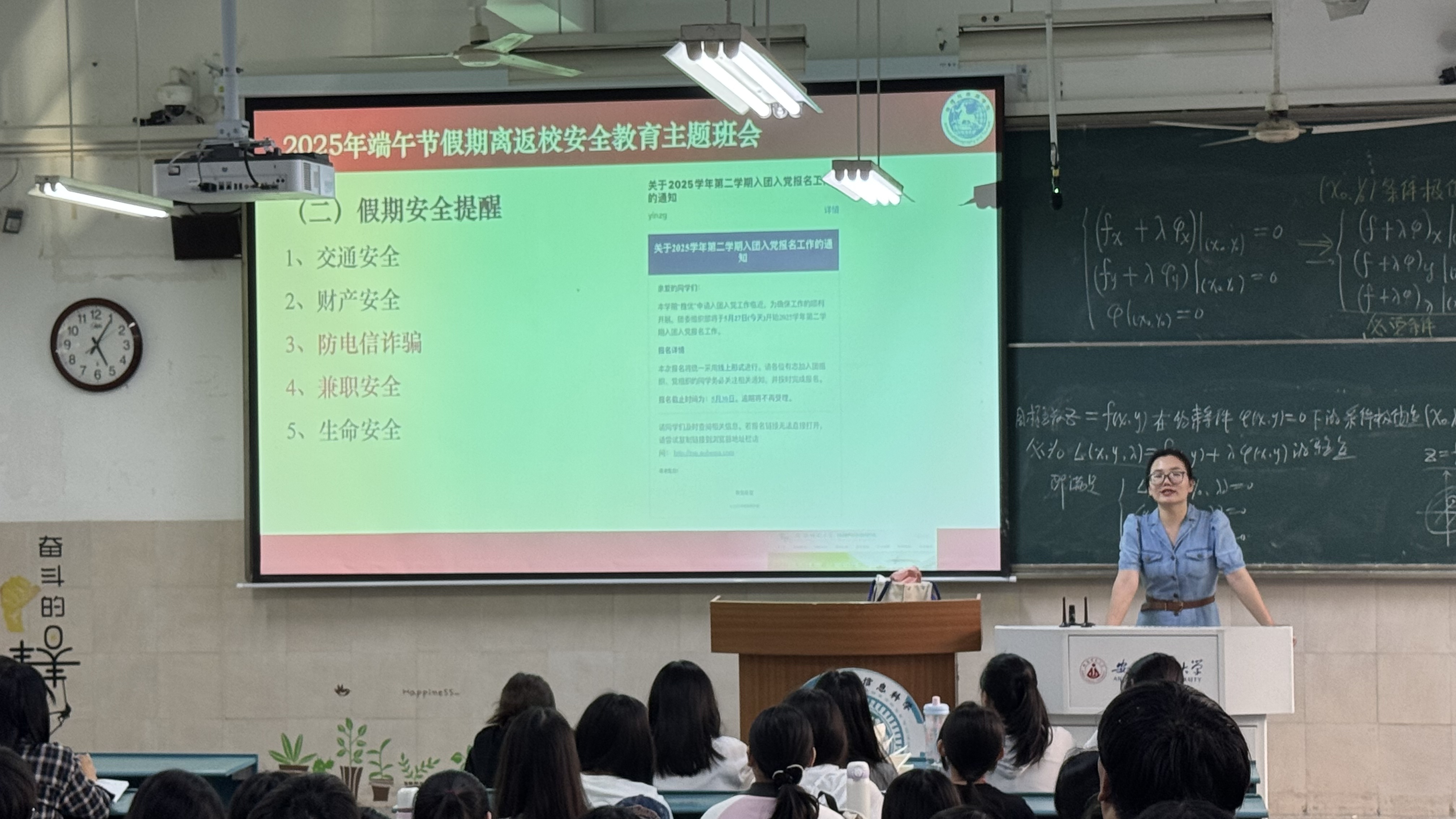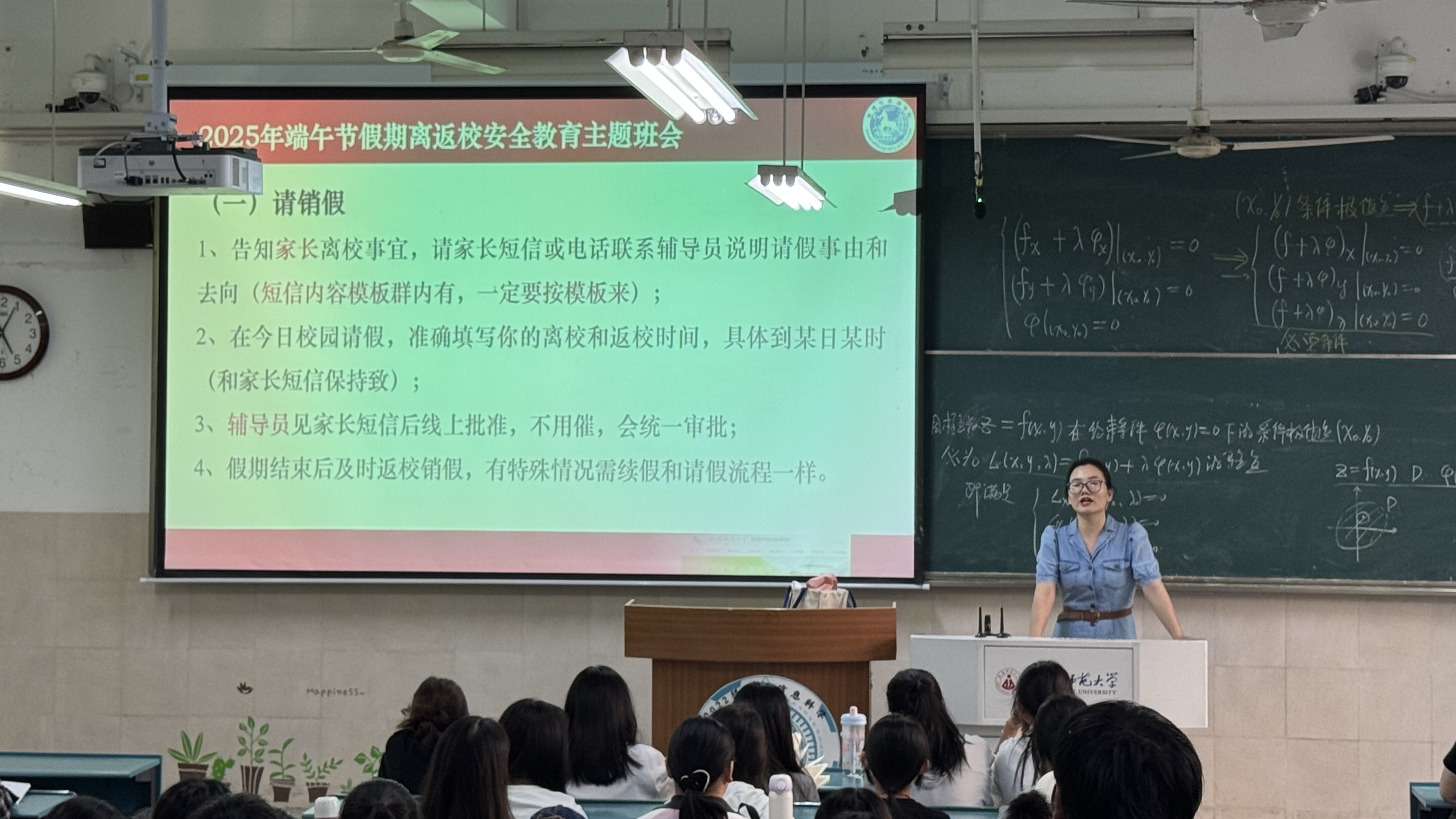 韦银艳就“2025年端午节假期离返校安全教育”进行重点强调,在请销假方面,明确要求同学们遵循规范流程。同时,从交通、财产、防电信诈骗、兼职、生命安全等方面进行安全提醒,全方位筑牢安全防线。