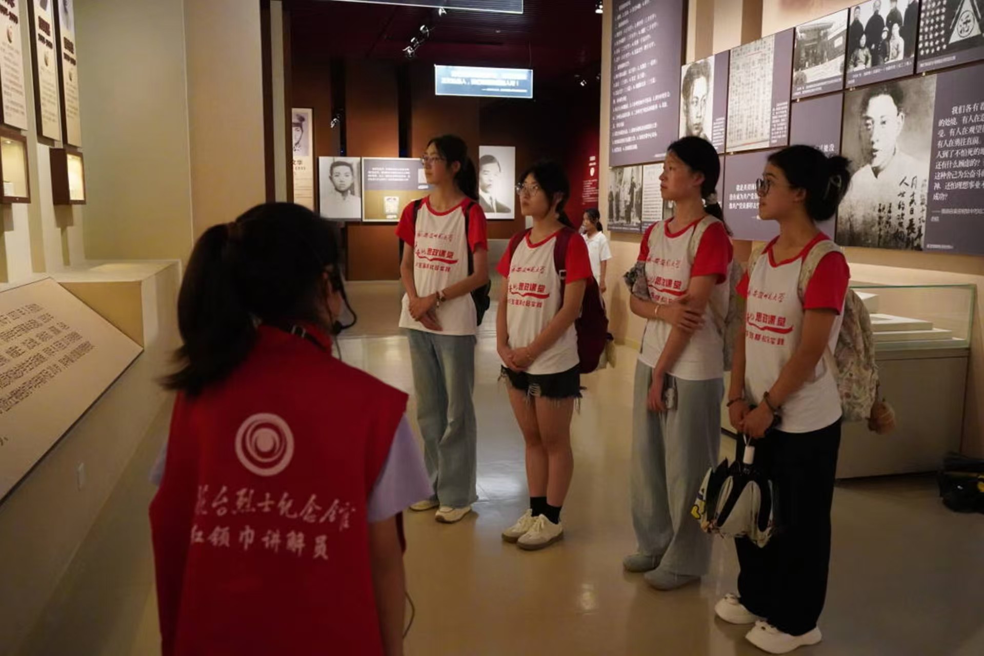 更令人触动的是,纪念馆内活跃着一群特殊的 “历史信使”——“红领巾讲解员”。这些身着红色志愿背心的青少年,虽面庞稚嫩,声音却清脆有力。他们熟练地讲述着一位位先烈的英勇事迹,每一个故事在他们的演绎下都生动鲜活起来。团队成员们被这些小讲解员的热情与专注所感染,纷纷围拢倾听。这种源自青少年群体的传承力量,让团队看到了红色精神跨越代际、生生不息的蓬勃生命力,也为团队在思考如何用青春话语传播红色文化方面提供了新的思路与启示。