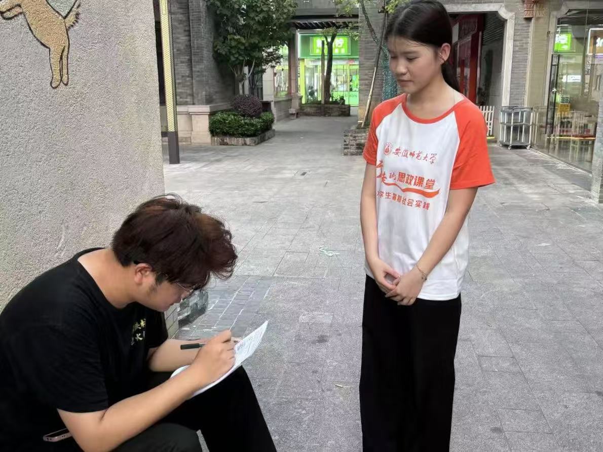 随后,实践团队队长武庆将行囊中的问卷发放给团队成员,“两人一组,每个人需要发放20份问卷。并且,在实践的过程中记得留存影像。”话音未落,9道身影没入古城小巷中。街巷旁、店铺边、居民生活区……都有团队成员实践的痕迹。