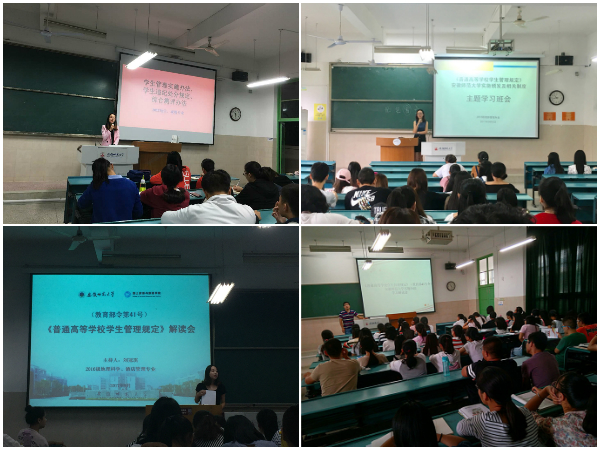 各年级辅导员先后召开《普通高等学校学生管理规定》(教育部41号令)主题班会10余场,并结合学生工作中的实际案例,告诫学生学习《普通高等学校学生管理规定》的重要性,促使学生树立主动学习、深入学习、强化学习的意识。