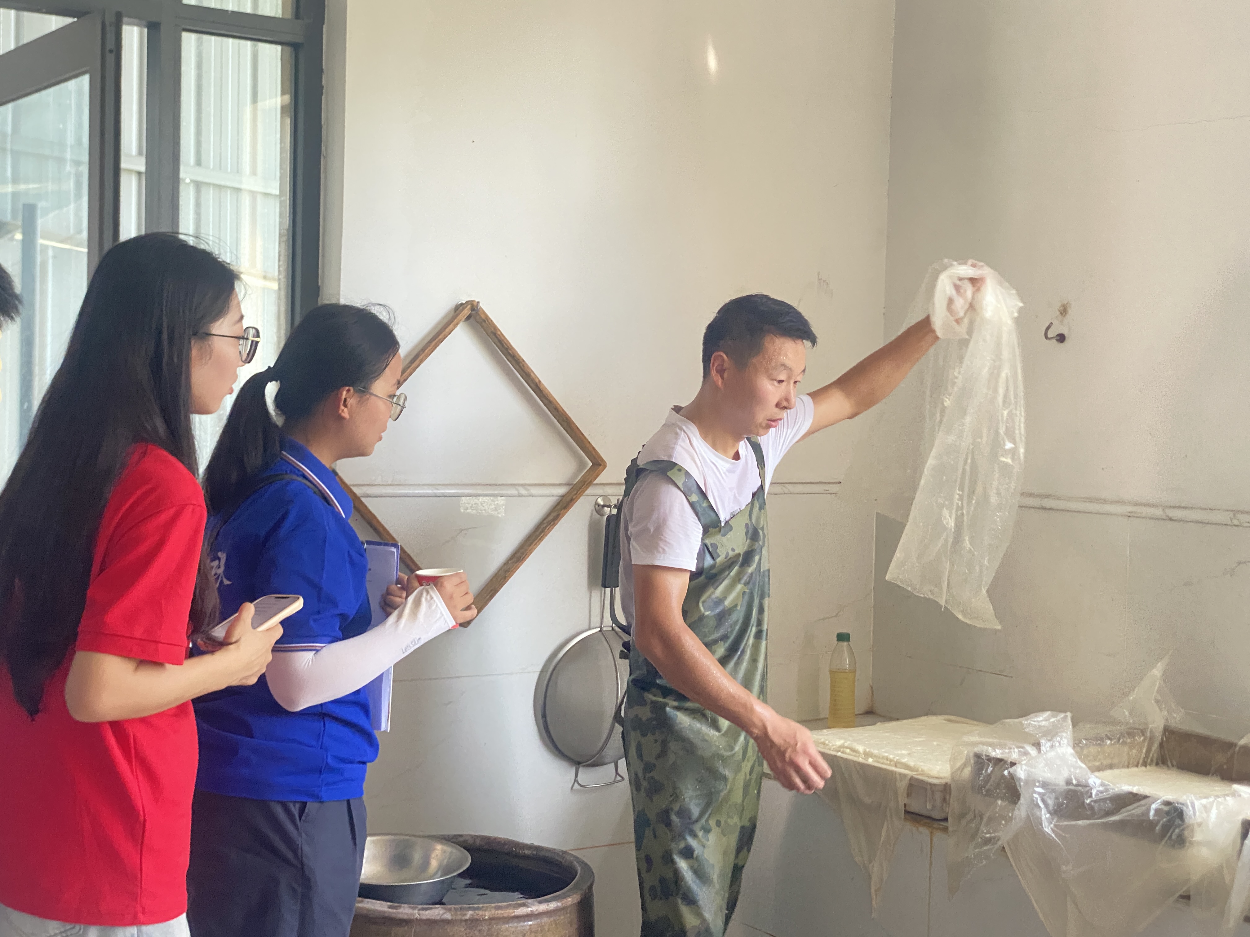 “淮畔四时 中州盛宴”二十四节气文化与旅游融合调研本科生社会实践团队走进淮南豆腐主题文化园和八公山乡大泉村,以豆腐传统制作技艺为切入点,通过走访文化园区、对话基层干部、观摩非遗传承,立体化考察非遗保护现状,探寻传统技艺赋能乡村振兴的实践逻辑。