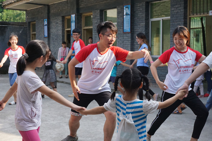 一场游戏,牵动你我的心。为了更好地和孩子们熟悉起来,消除陌生感,队员们带着孩子做了一场破冰游戏——圆圈抱团游戏,由队员们和孩子们手拉手围成一个圆圈,按照顺逆时针的方向走动起来,然后根据数字口令迅速抱团,落单的人要接受“惩罚”,即表演节目。“太阳当空照,花儿对我笑……”《上学歌》《青春修炼手册》、太极拳表演,花样风格的才艺表演令孩子们捧腹大笑。