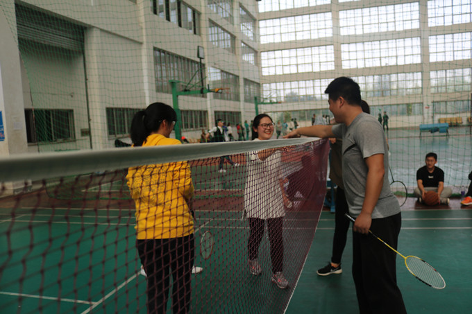 羽毛球赛事中分为单打和双打,由同学们随机自由组合。除了本身的实力以外,在双打中,与同伴的配合也尤为重要。辅导员吴燕与同学们更是展开激烈对战。比赛结束后,秉承友谊第一、比赛第二的竞赛精神,双方队员都礼貌握手,相互祝贺。